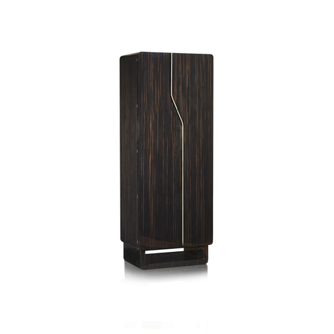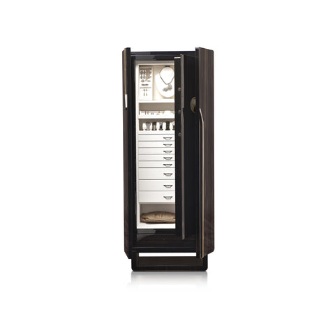 A safe jewelry cabinet in glossy ebony, with ruthenium accessories. The safe is opened via