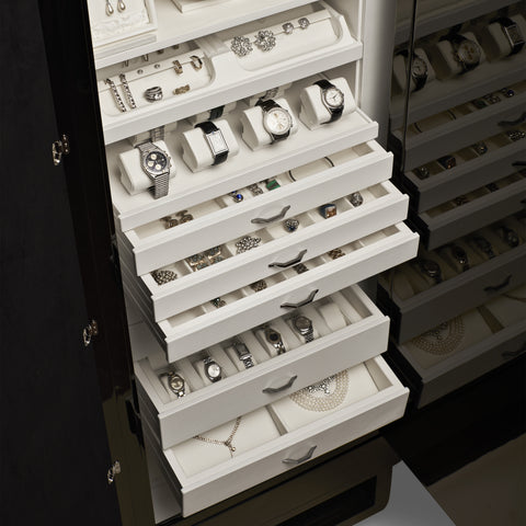 Battery-operated, it offers both practicality and security. In the upper section, a bust for necklaces and removable trays for jewelry, lined with suede fabric, provide neat organization. A hidden secret compartment is located at the back. The drawers, with white leather fronts, are organized to hold jewelry and lined inside with white suede fabric.