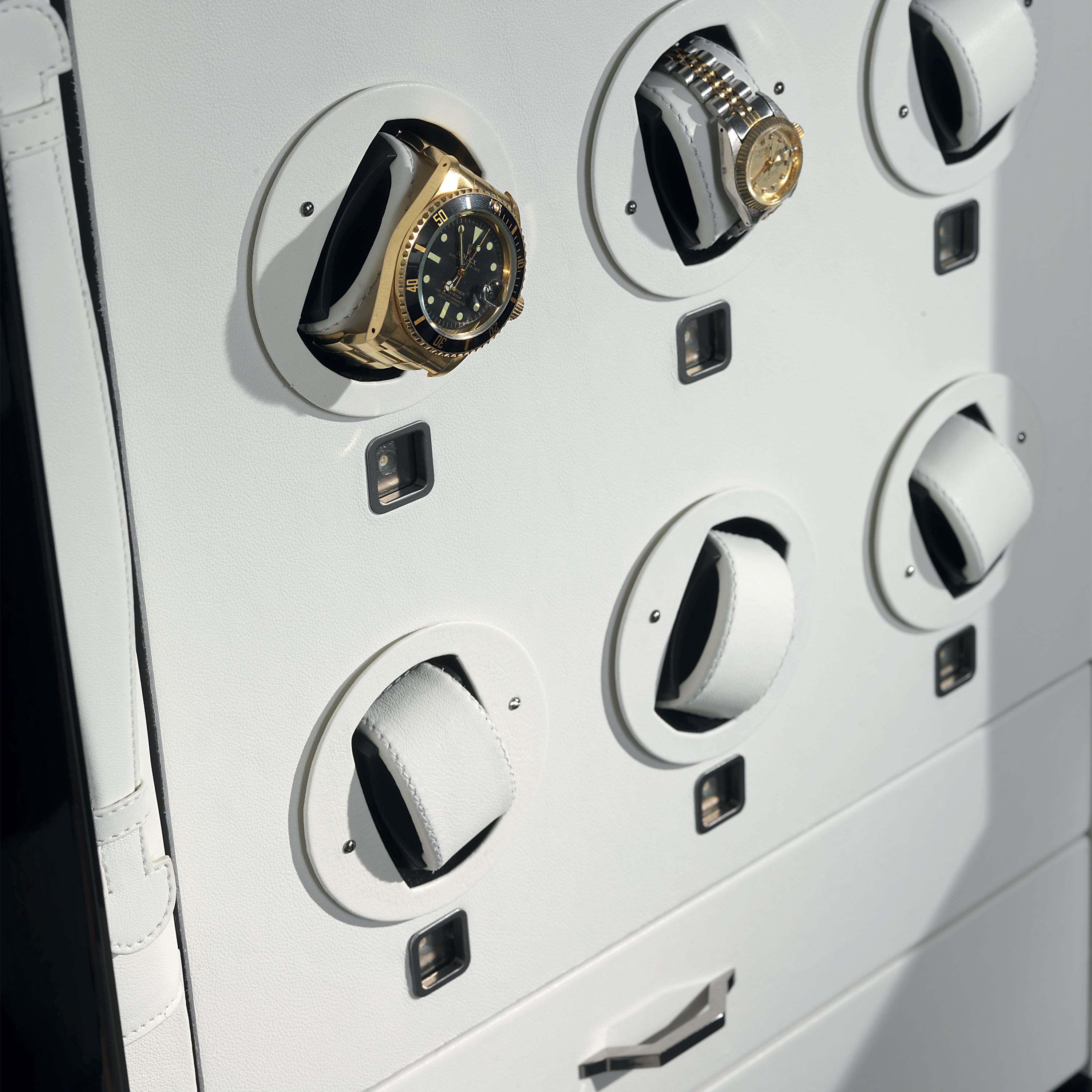 Armoire in polished ebony with safe, anchorable to the wall. Biometric opening device and emergency key system. Watch winders entirely made in Switzerland. Secret compartment, inside lined in ultrasuede. Safe covered with polished ebony and black leather. Bullets proof glass (1000 Joule) and antibreaking (P6B), nine winders, two drawers and travel leather pouch.