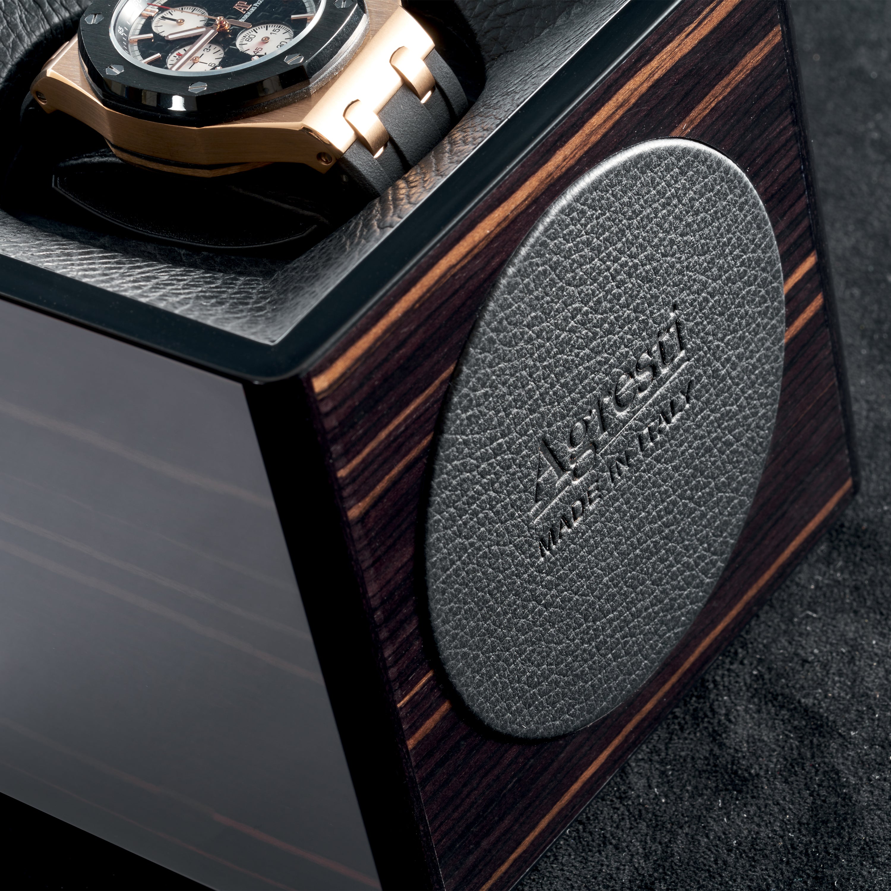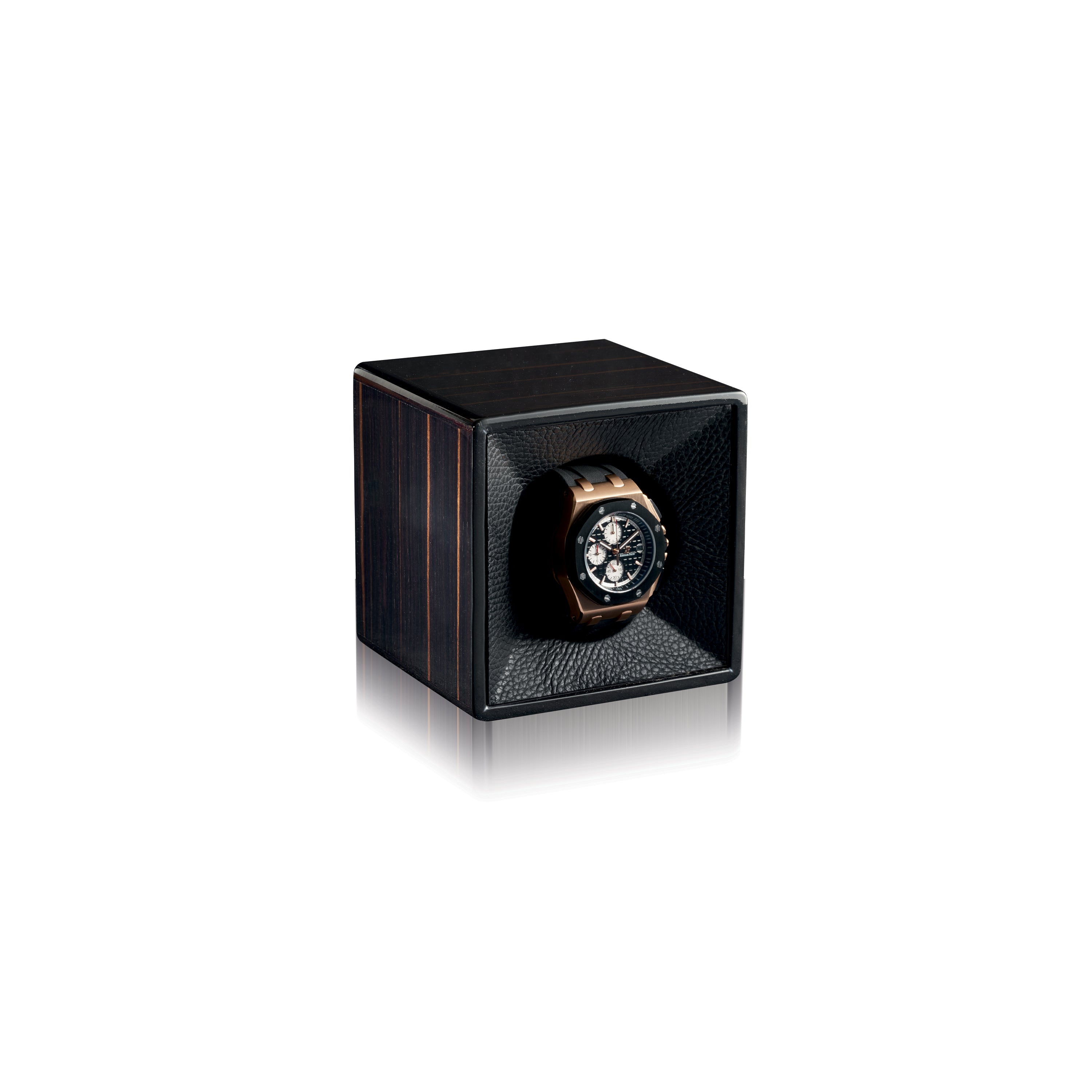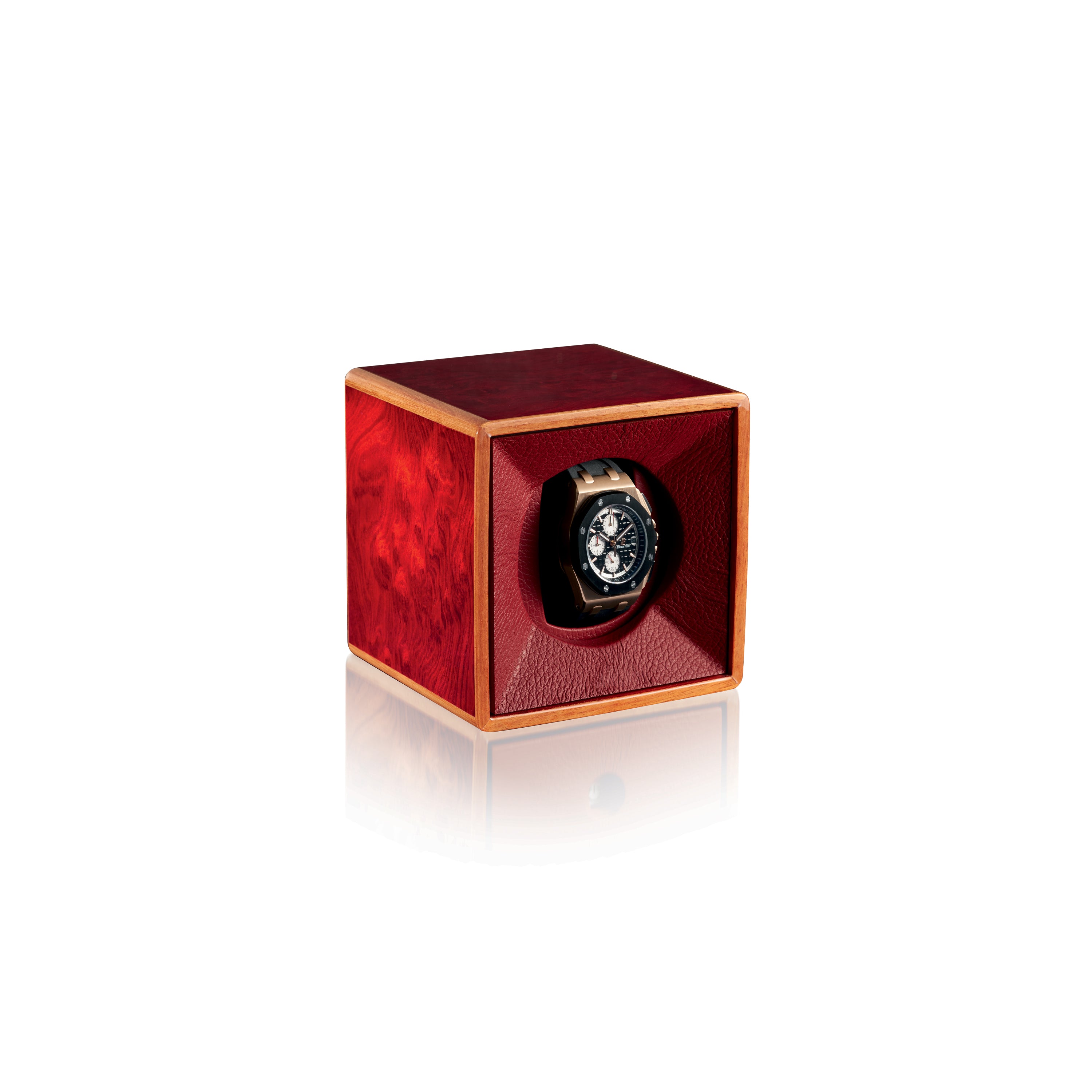 Watchwinder for automatic watch. Leather lined . Winder made in Switzerland , battery operated.