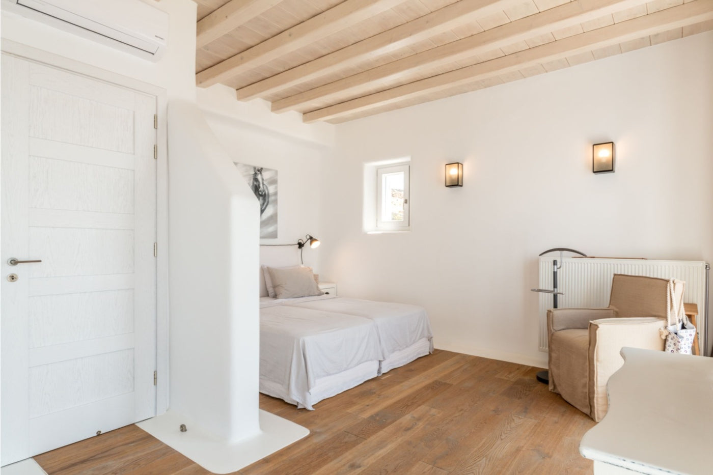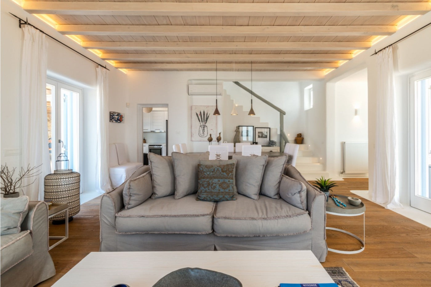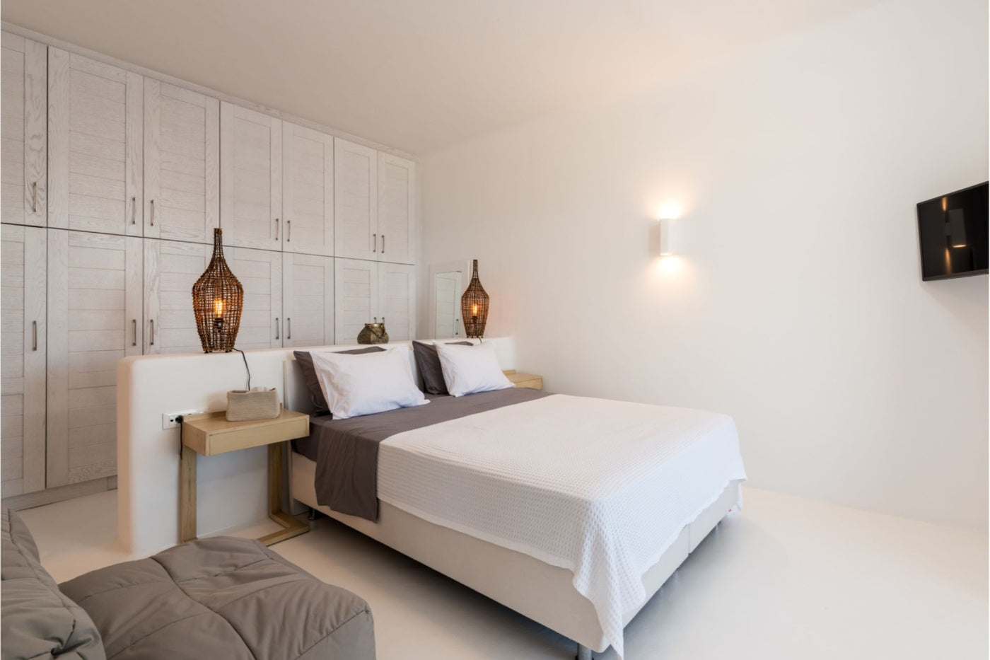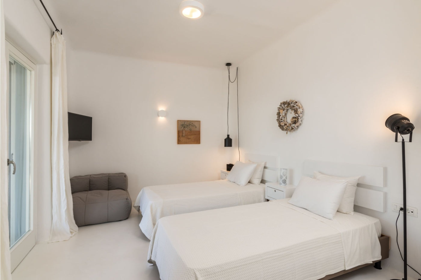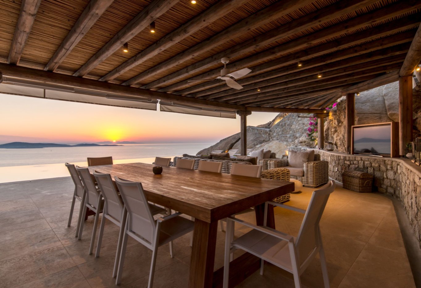 With mesmerizing Sea and Sunset views, will offer you Al Mare Estate relaxation with your family or friends while being in a short 10 min drive from Mykonos Town and all the famous destinations Interni and the most famous beach bar restaurants of Scorpios and Nammos. The property is spread across 3 levels and consists of the main house and a detached guest room. In the main house, you will find an open-plan living room combined with a dining table made to host up to 6 guests, a fully equipped kitchen with modern appliances, and surrounded by large windows flooding the room with sunlight and offering spectacular views. In the upper is located one twin bedroom with en suite bathroom and private balcony with sea and sunset views. A few steps lower you will find the detached guest room consisting of 2 double bedrooms with en suite bathrooms, a sea view, and direct access to the pool area. Step outside to enjoy the private infinity pool spread just above the cliff of the Pouli area. Take a morning dip to start your day fulfilled with energy and strength before you start the exploration of Mykonos island. Invite your friends over for lunch prepared at your outdoor BBQ facilities and dine al fresco under the shades of the pergola! Al Mare Estate provides you with your private place to relax or just in front of the amazing Aegean!