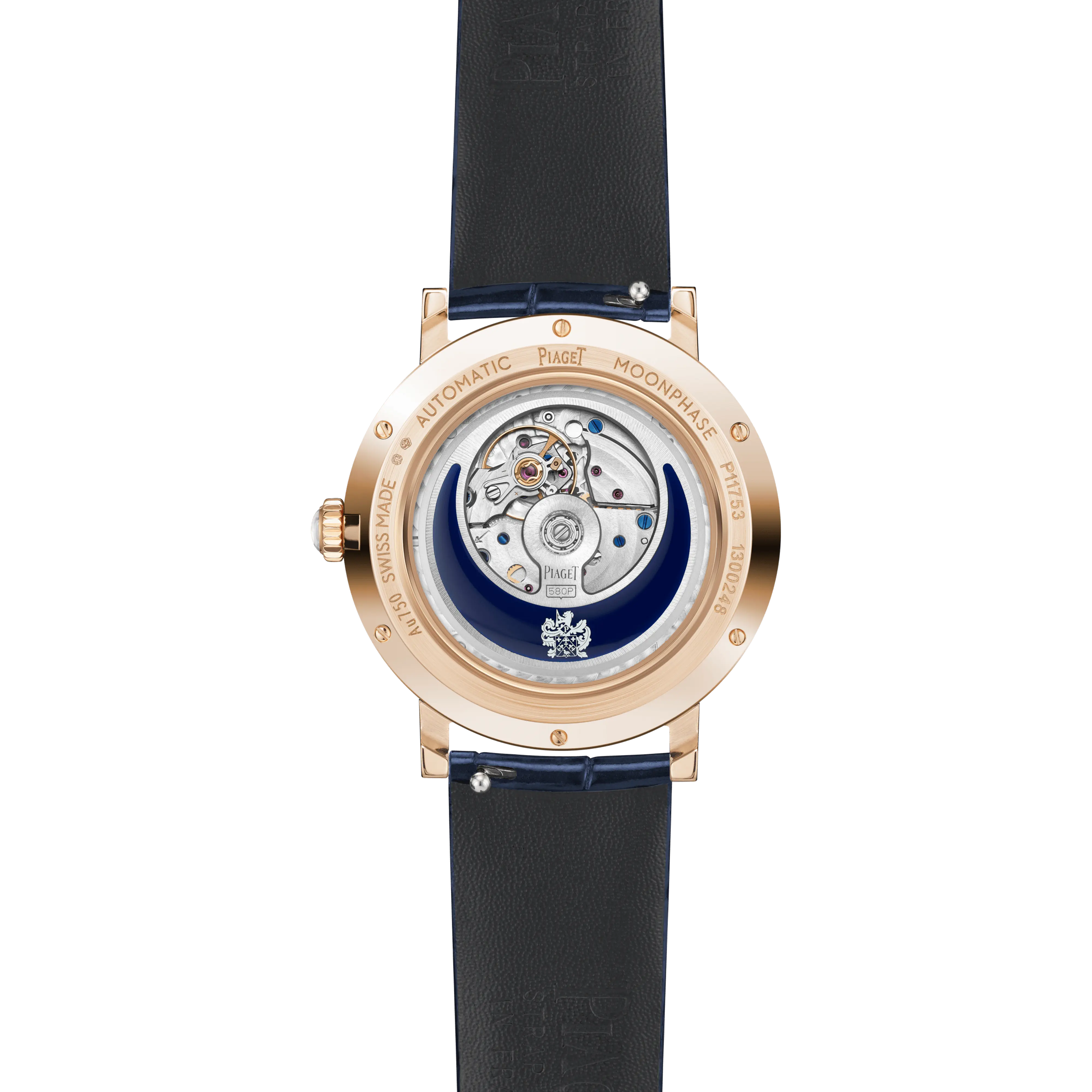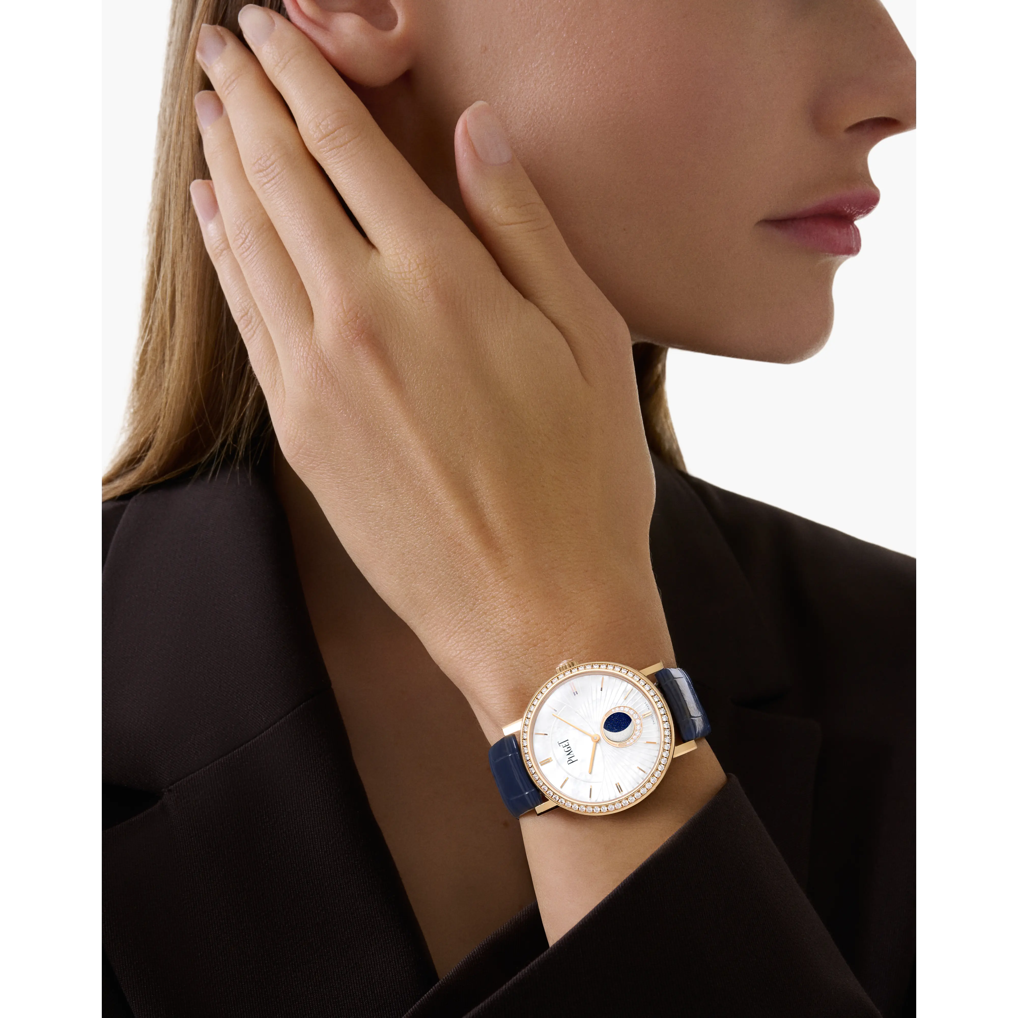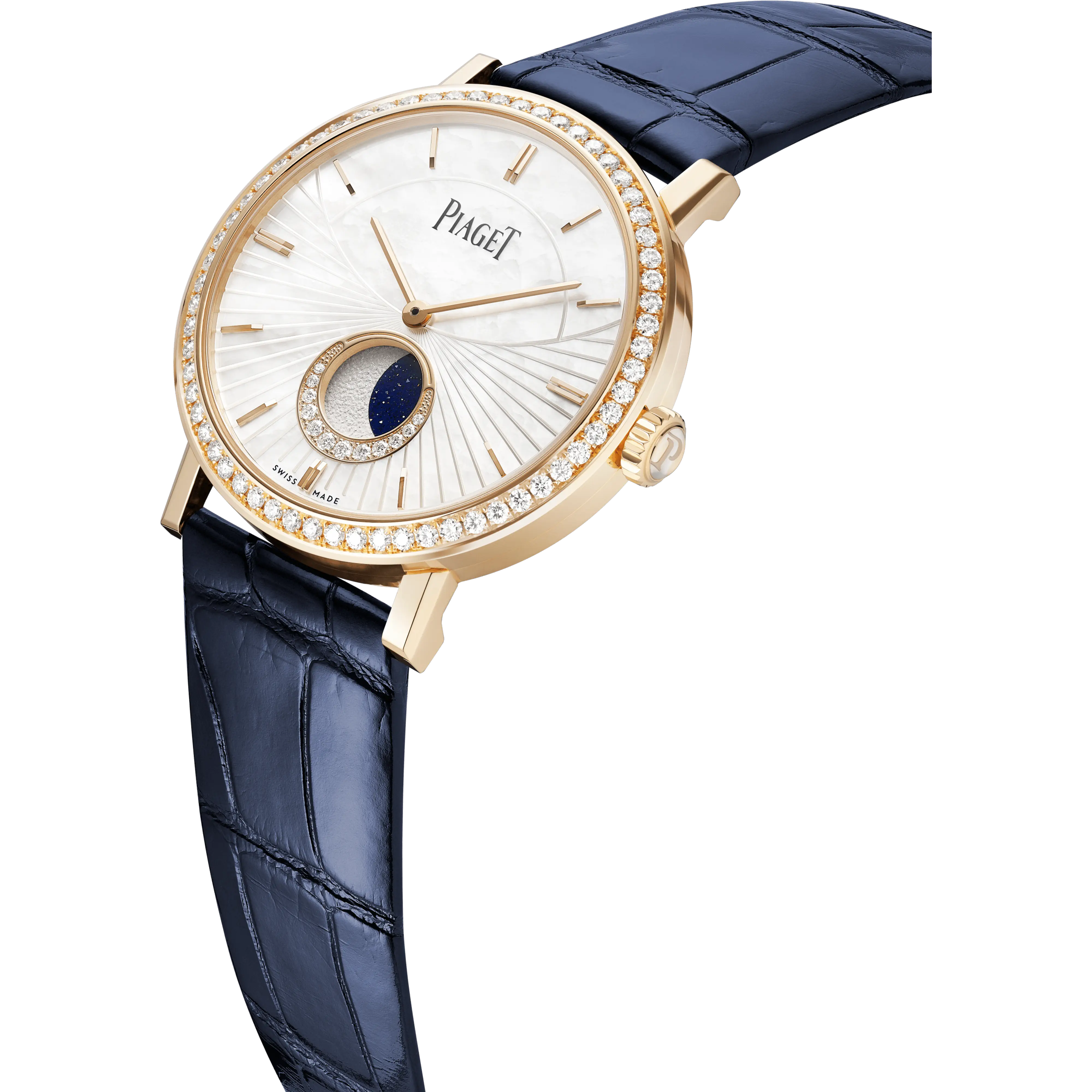 Altiplano Moonphase watch, 36 mm. Case in 18K rose gold set with 62 brilliant-cut diamonds (approx. 0.87 ct). Dial set with 12 brilliant-cut diamonds (approx. 0. 07 ct) and a white mother-of-pearl base plate (approx. 3.23 cts). Sapphire crystal case back. Interchangeable strap. 580P Altiplano Manufacture automatic mechanical movement with moon phases.