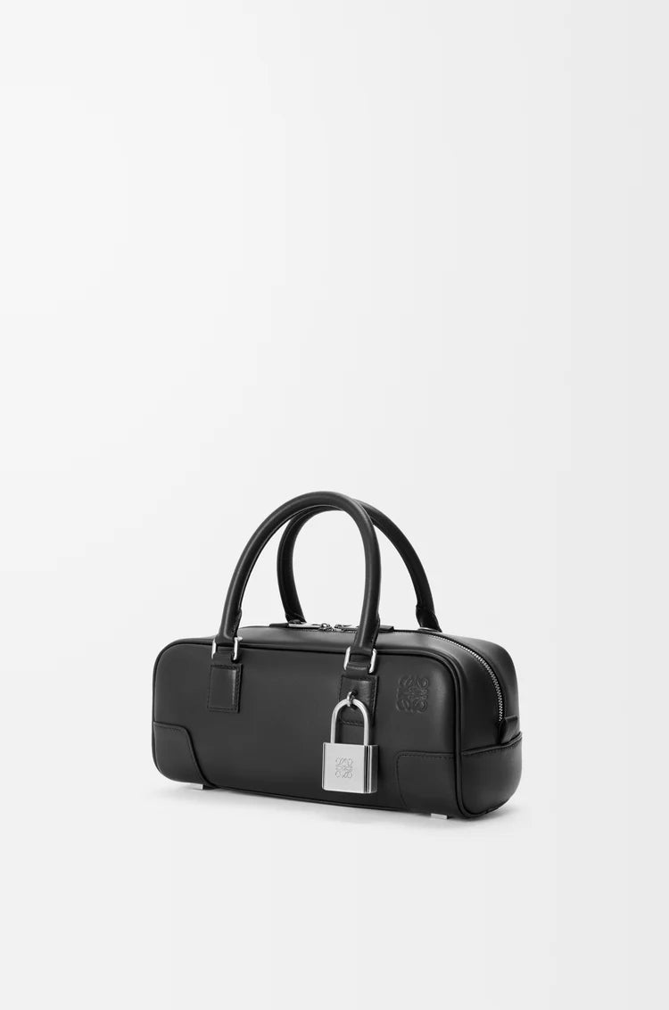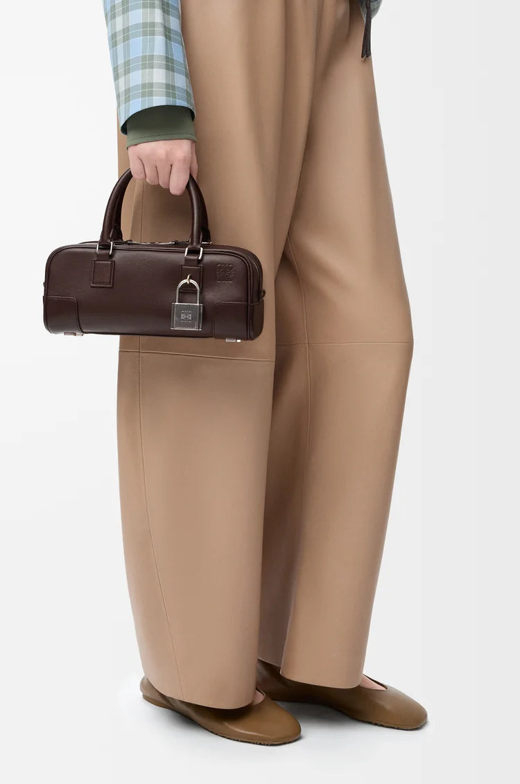 The Amazona displays a classic shape complemented by a signature padlock, here revisited in oversized proportions. This cropped version is crafted in shiny calfskin with vintage-finish hardware.