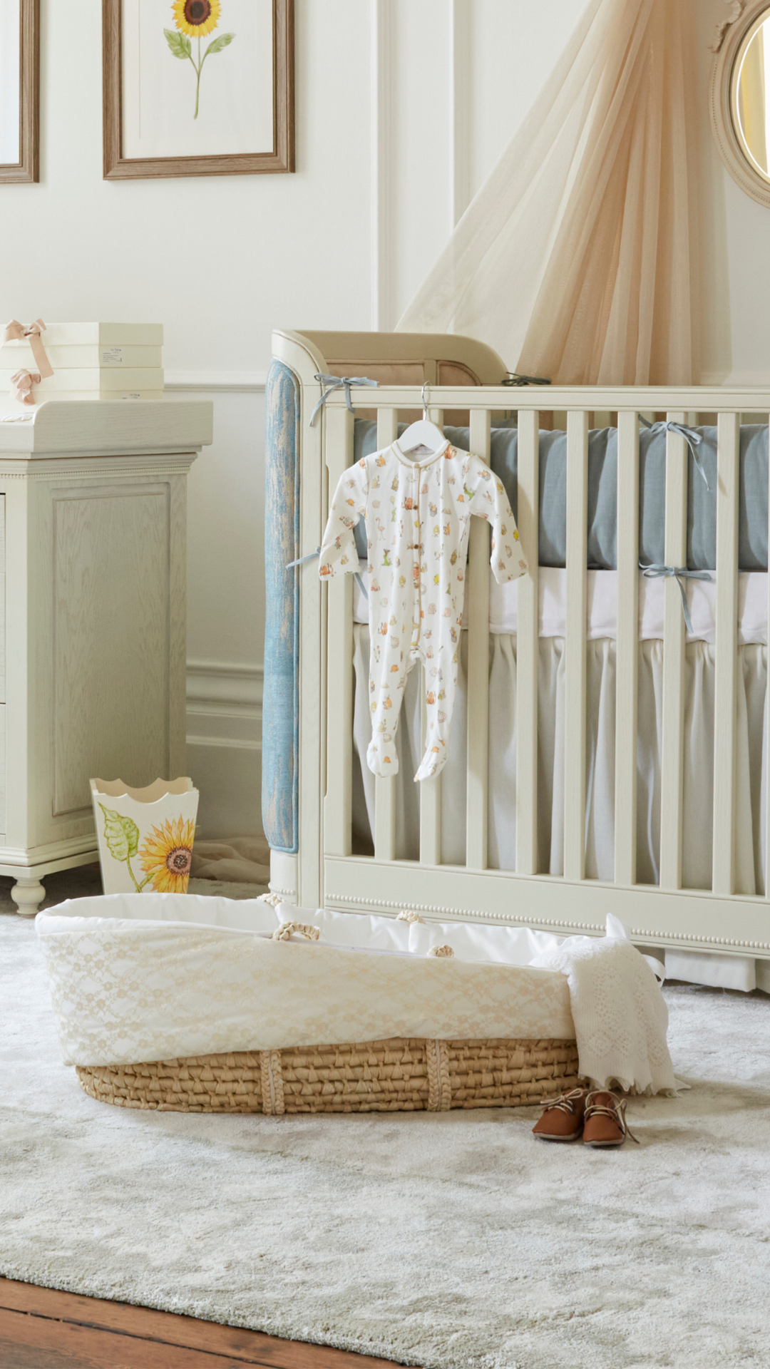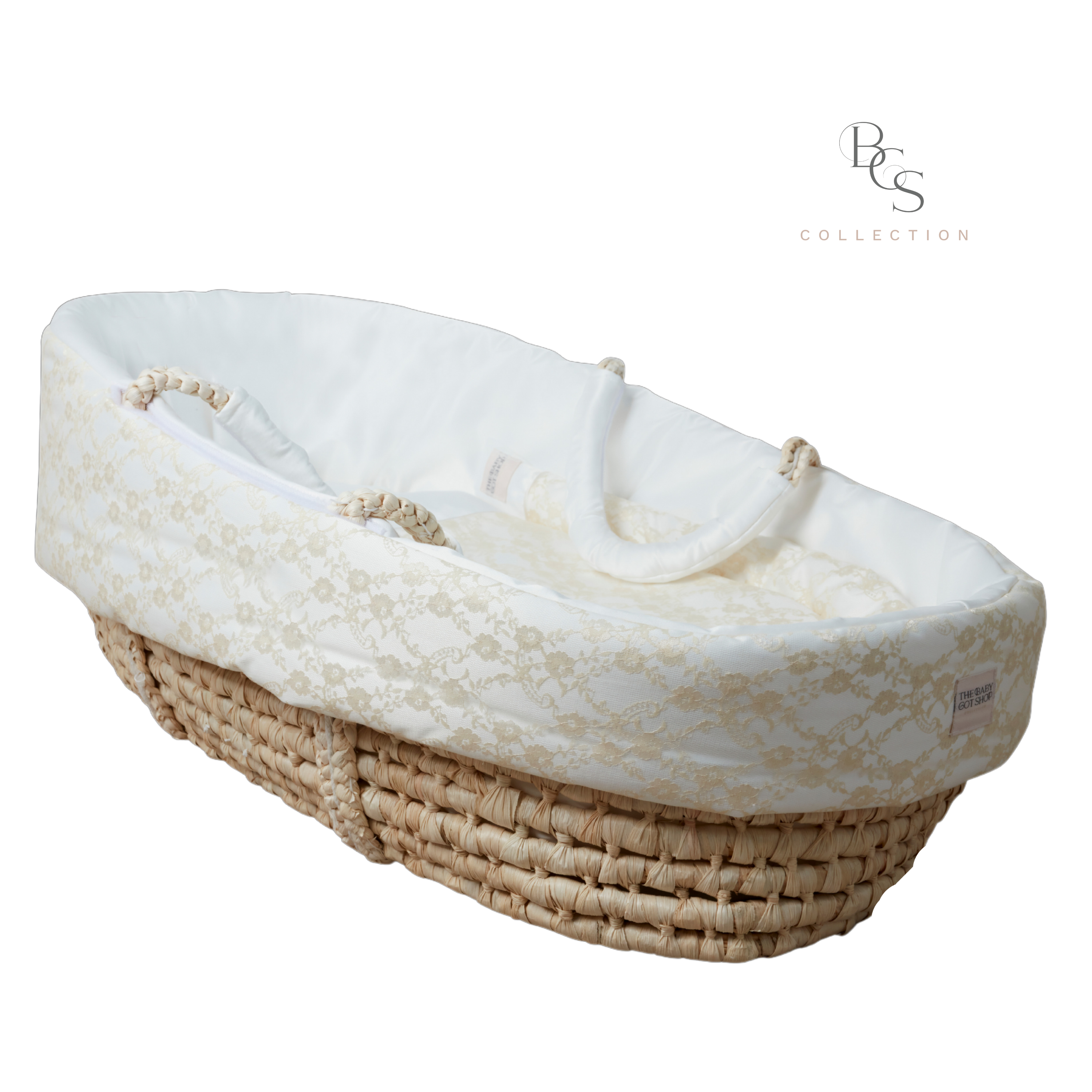 The Ayesha Luxury Moses Basket is your newborn's most elegant first bed. With ornate patterns and delicate material, the baby Moses Basket is designed in ivory cotton, soft cotton and delicate gold lace. Complete with a quilt, pillow and fitted sheet, it looks magnificent in a baby nursery or on your bedside.