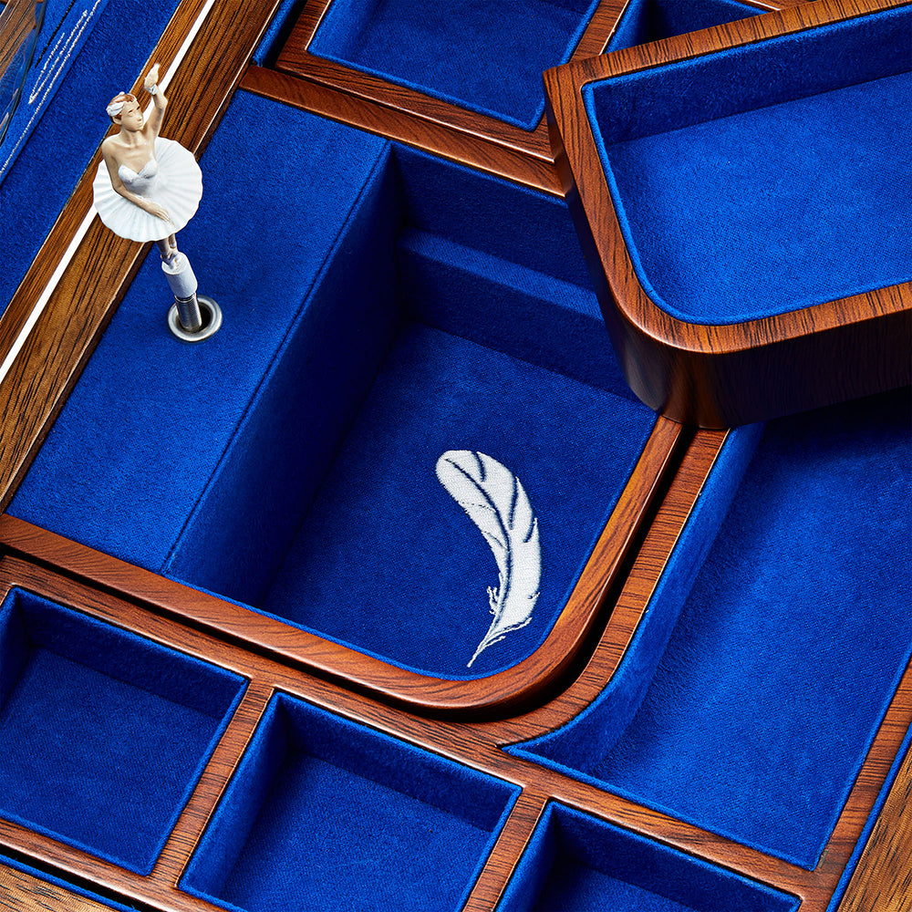 The Ballet collection is inspired by Philipp Wolf III’s original ballerina box. Choose from two beautiful designs, Sleeping Beauty or Swan Lake. Discover walnut wood veneer with marquetry detailing, embroidered backdrops surrounding scallop-edged mirrors above jewellery compartments and interchangeable hand-painted ballet dancers with different skin tones.