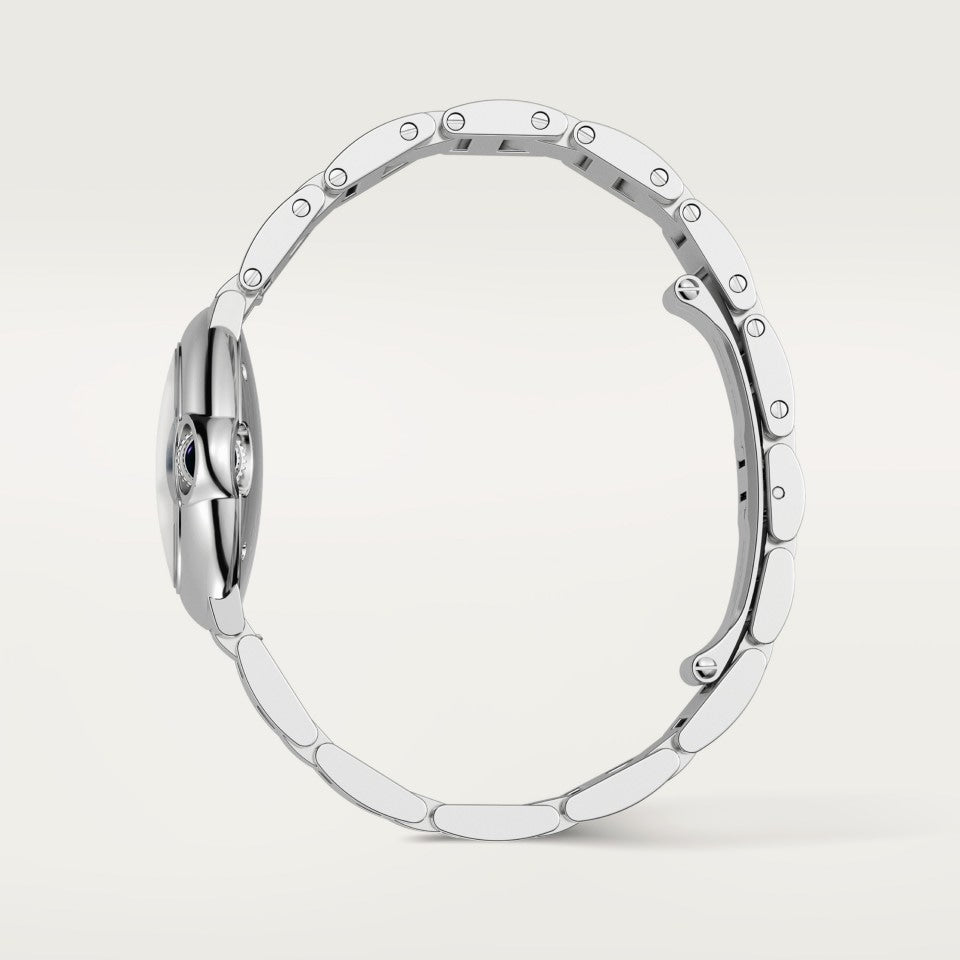 Ballon Bleu de Cartier watch, 28 mm, quartz movement. Steel case, fluted crown set with a synthetic cabochon-shaped spinel, silvered opaline dial, Roman numerals, blued-steel sword-shaped hands, sapphire crystal. Interchangeable steel bracelet. Case dimensions: diameter: 28.6 mm, thickness: 9.35 mm. Water-resistant to 30 metres.
