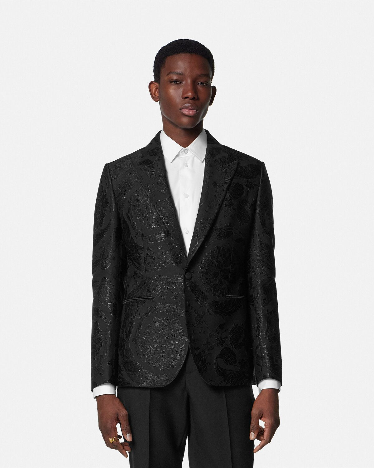 This single-breasted blazer is crafted from a wool blend featuring a tonal Barocco jacquard motif with accent lurex threading. The sartorial style has peaked lapels with a single button closure and is fully lined. A jacquard Versace tailoring label details the sleeve.