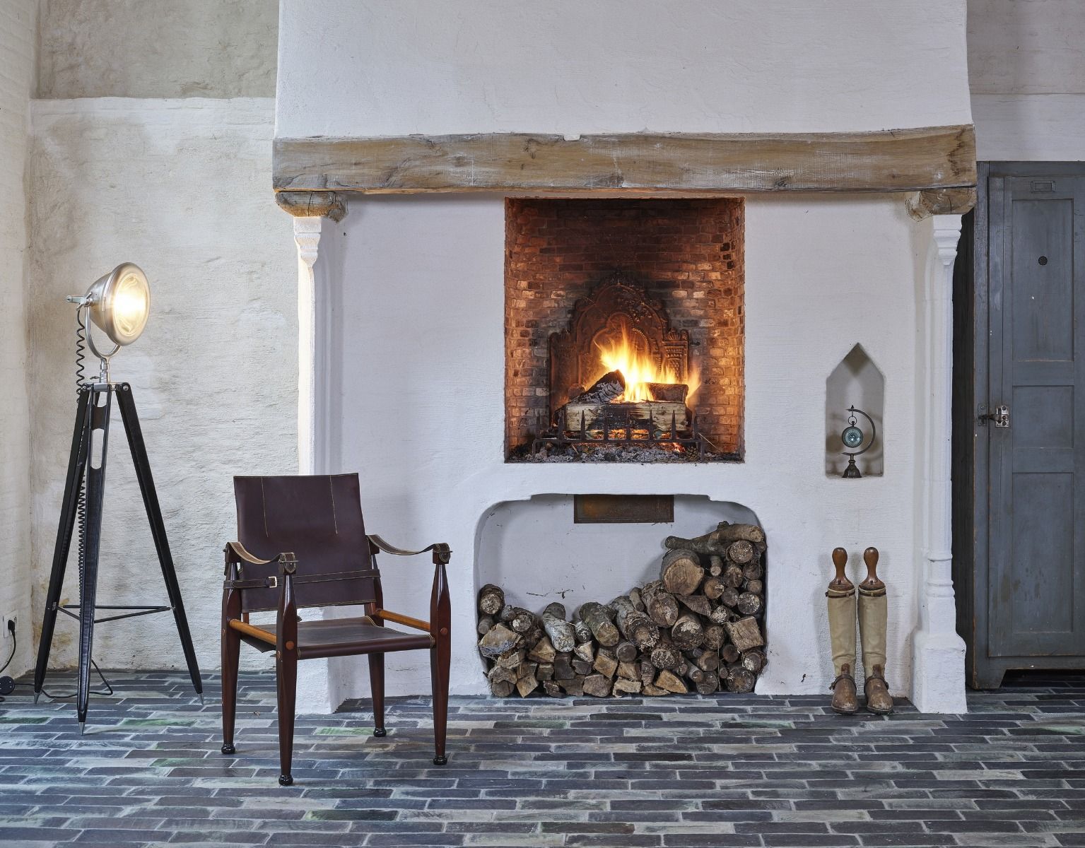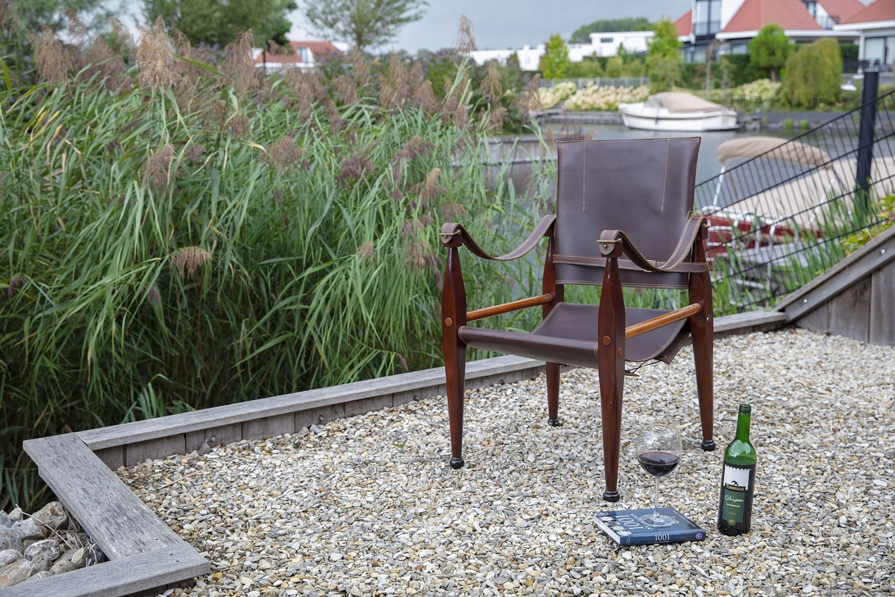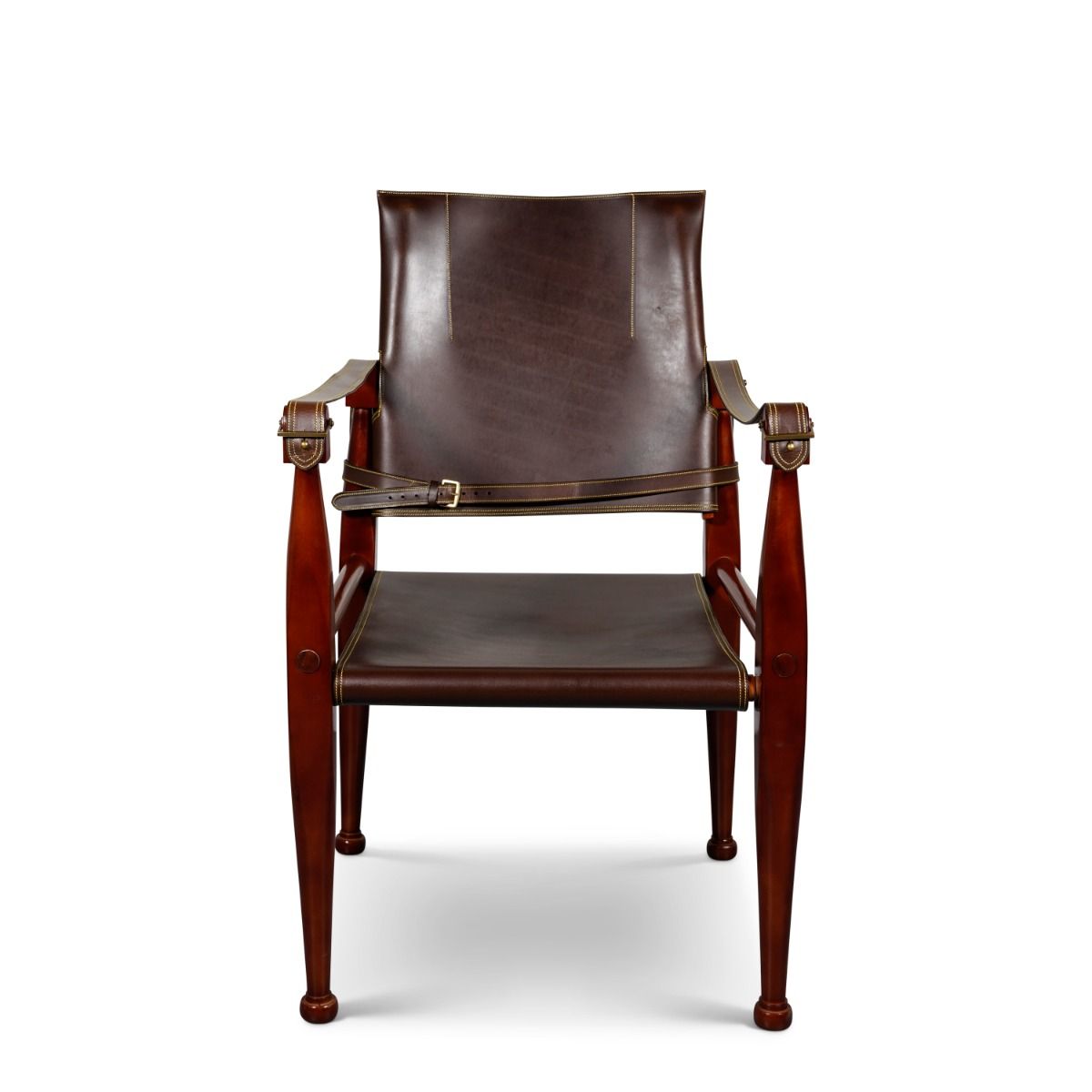 Meticulous replica of a 19th C. British officer's campaign chair. Heavy, oiled bridle leather in British tan, hand stitched. Brass hardware and hand turned maple wood parts.