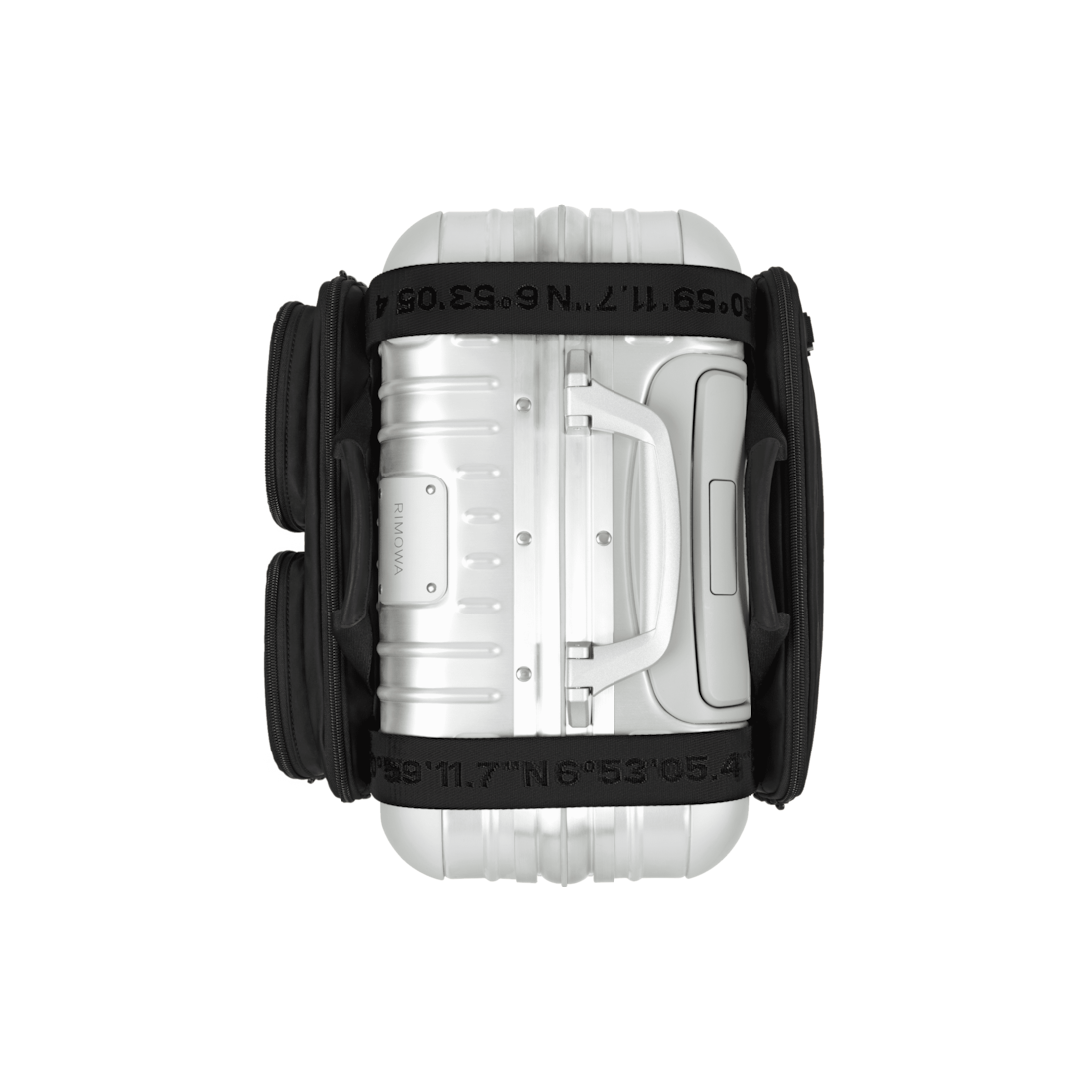 Conveniently secured to your RIMOWA Cabin suitcase using adjustable straps, it boasts a clever formation of pockets and compartments that offer easy access to your essentials such as phones, electronics and toiletry pouches. Two large zipped pockets can each fit a laptop of up to 16" in size, or documents and magazines.