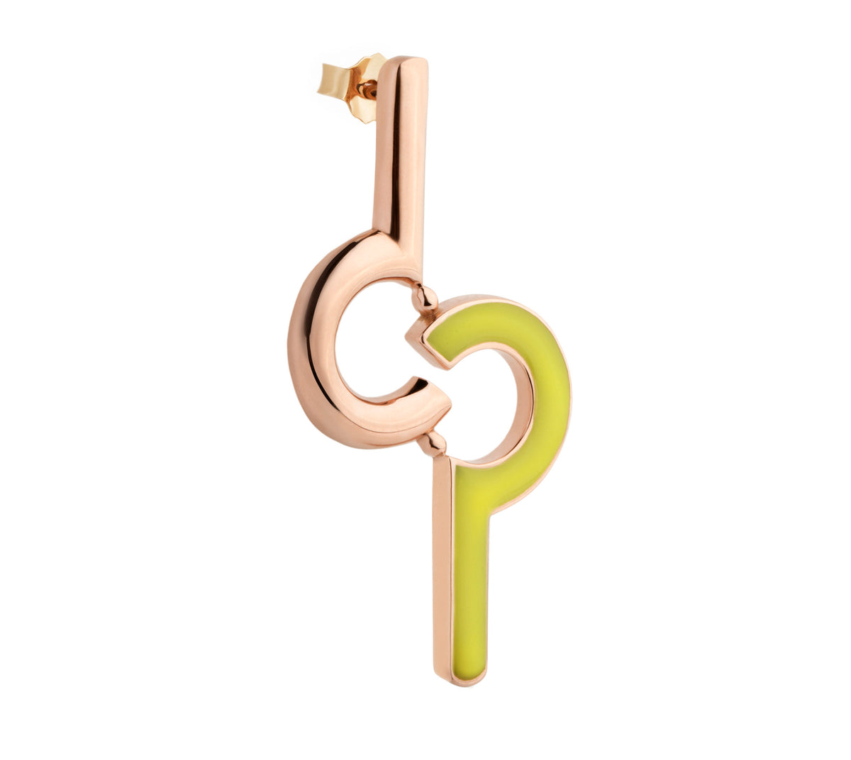 Single Hook Logo Earring. Half in Gold, Half in Yellow Enamel.