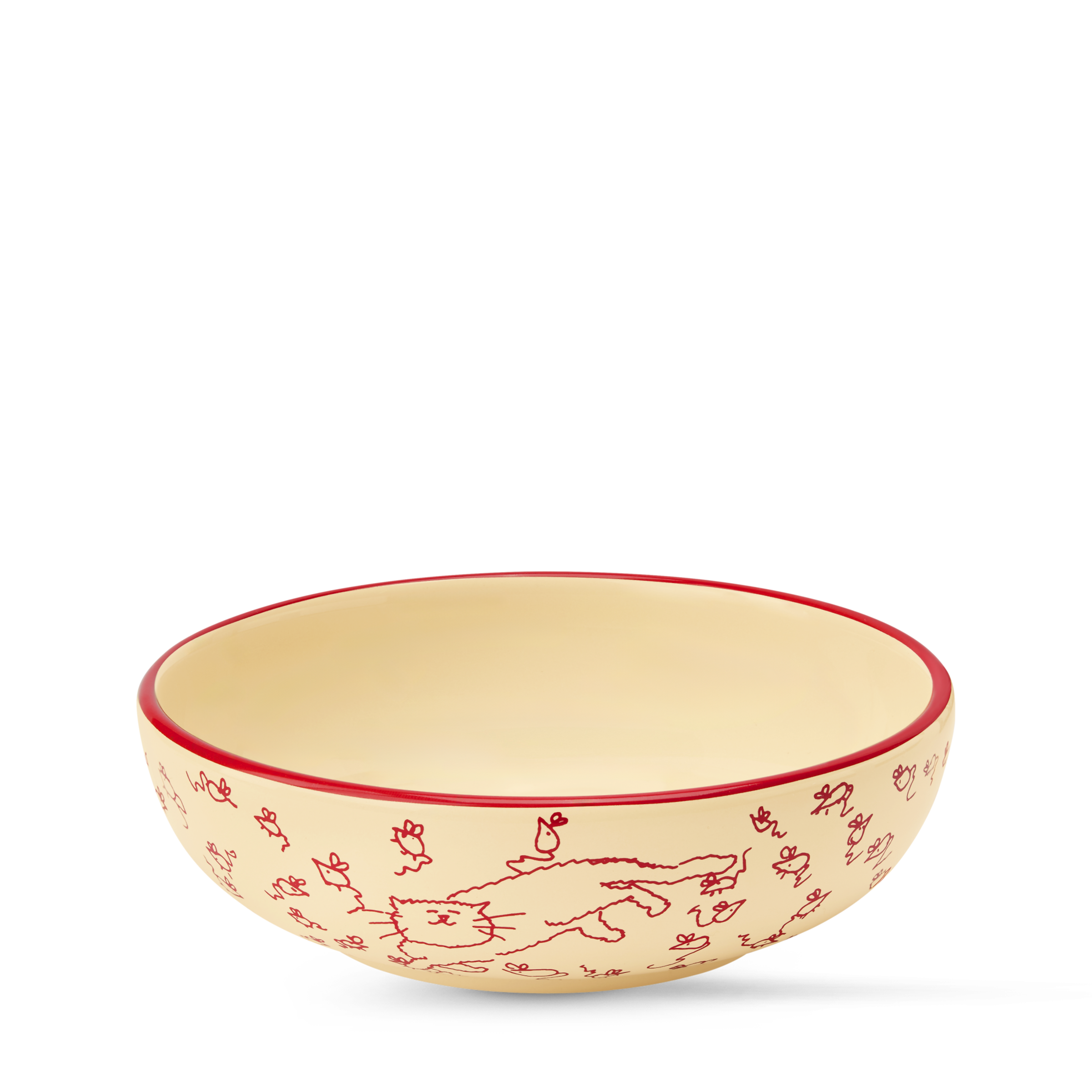 The Cat Bowl is a darling accessory for a beloved feline's meals and drinks. The cream-coloured exterior playfully features red cats and mice, a speciality pattern from the artist and editor Grace Coddington. A cat's face in a sleek gold tone features on the bottom of the interior. The ceramic piece is dishwasher-safe.