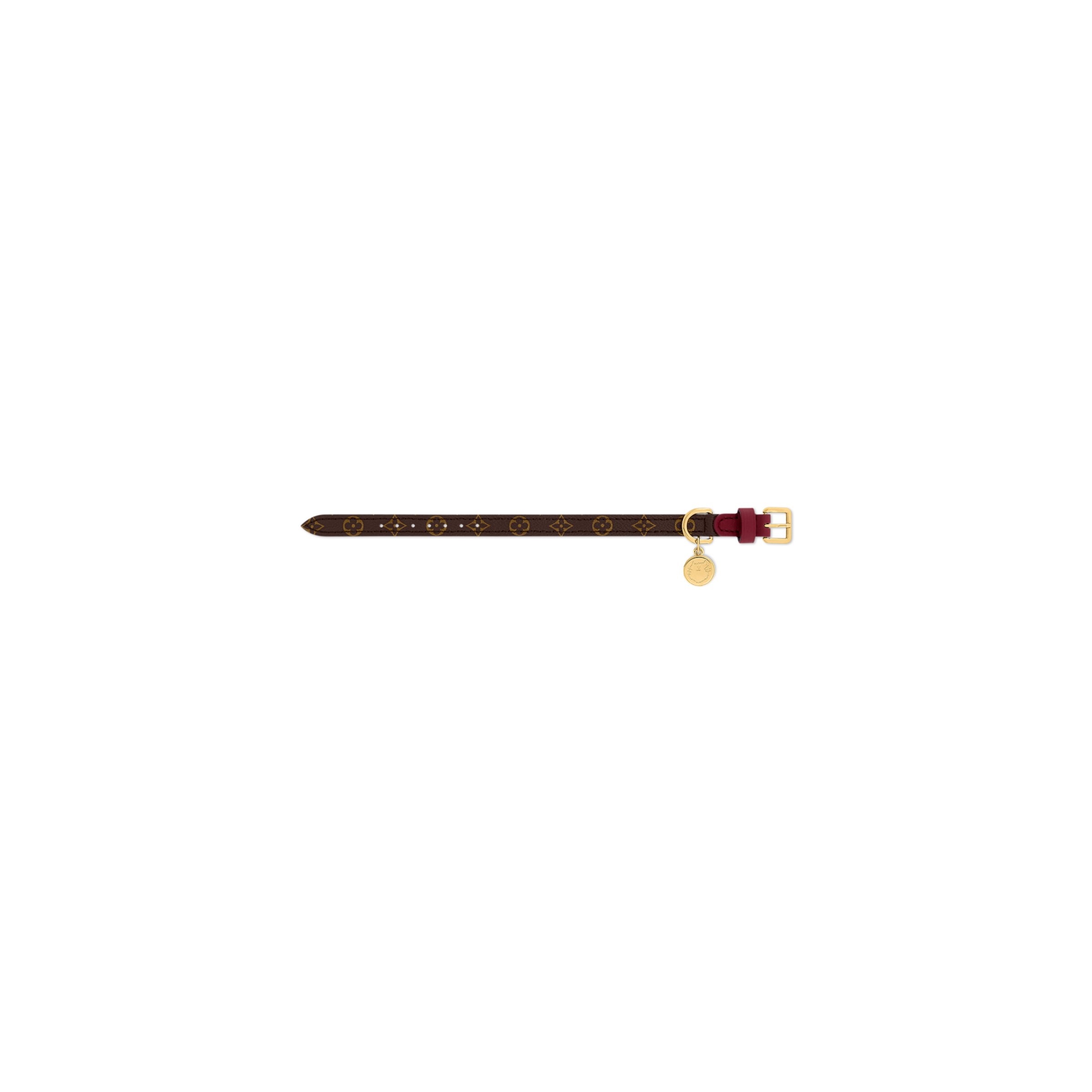 A style from the cross-category Travel With capsule, the cat collar is a cheeky accessory for a cherished pet. The adjustable Monogram coated canvas strap radiates Louis Vuitton savoir-faire and the burgundy red leather reverse can be hot stamped. From the collar hangs a gold-toned charm engraved with a cat face designed by Grace Coddington.