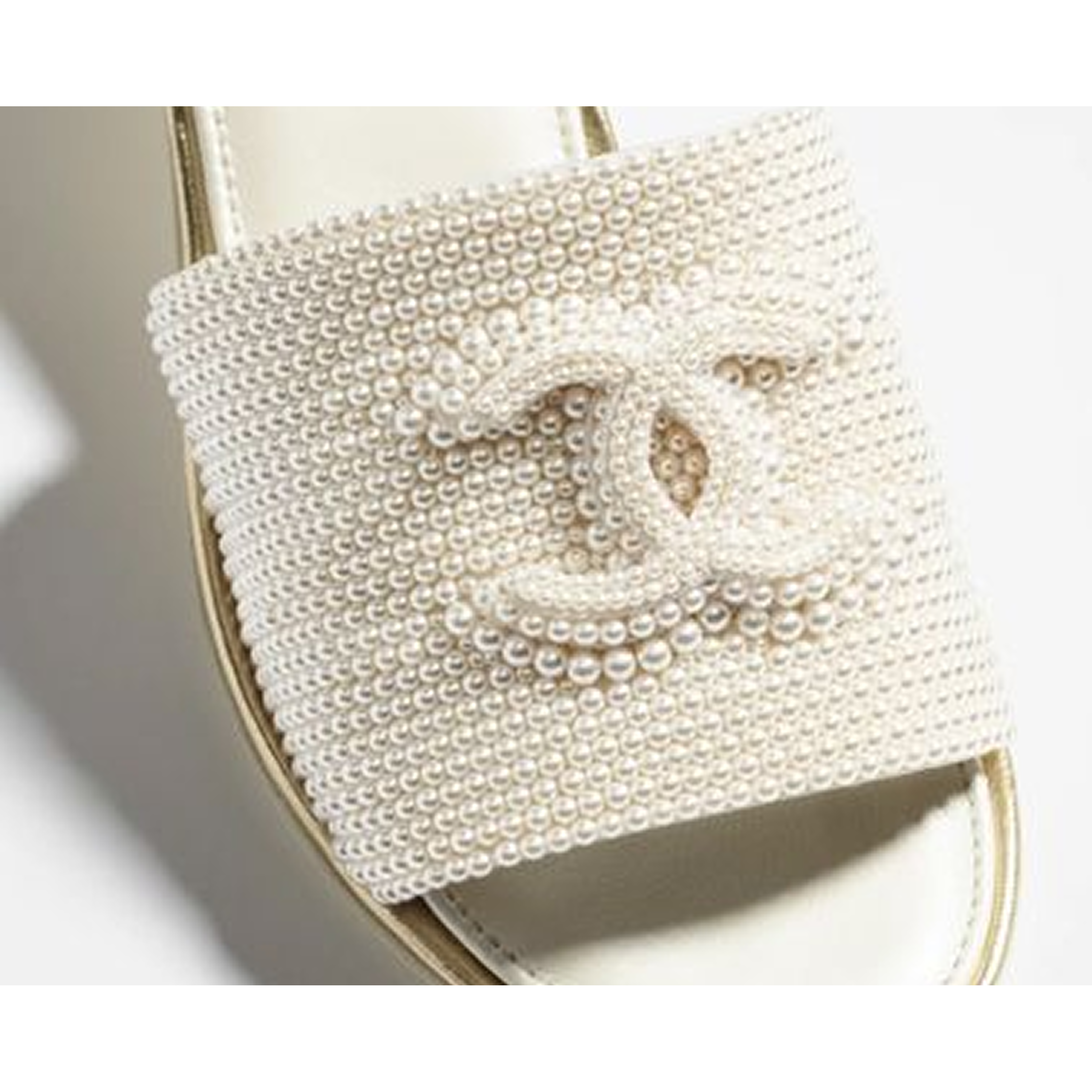 Elegant slide sandals featuring the iconic Chanel CC logo adorned with luminous pearls, blending timeless sophistication with effortless style.
