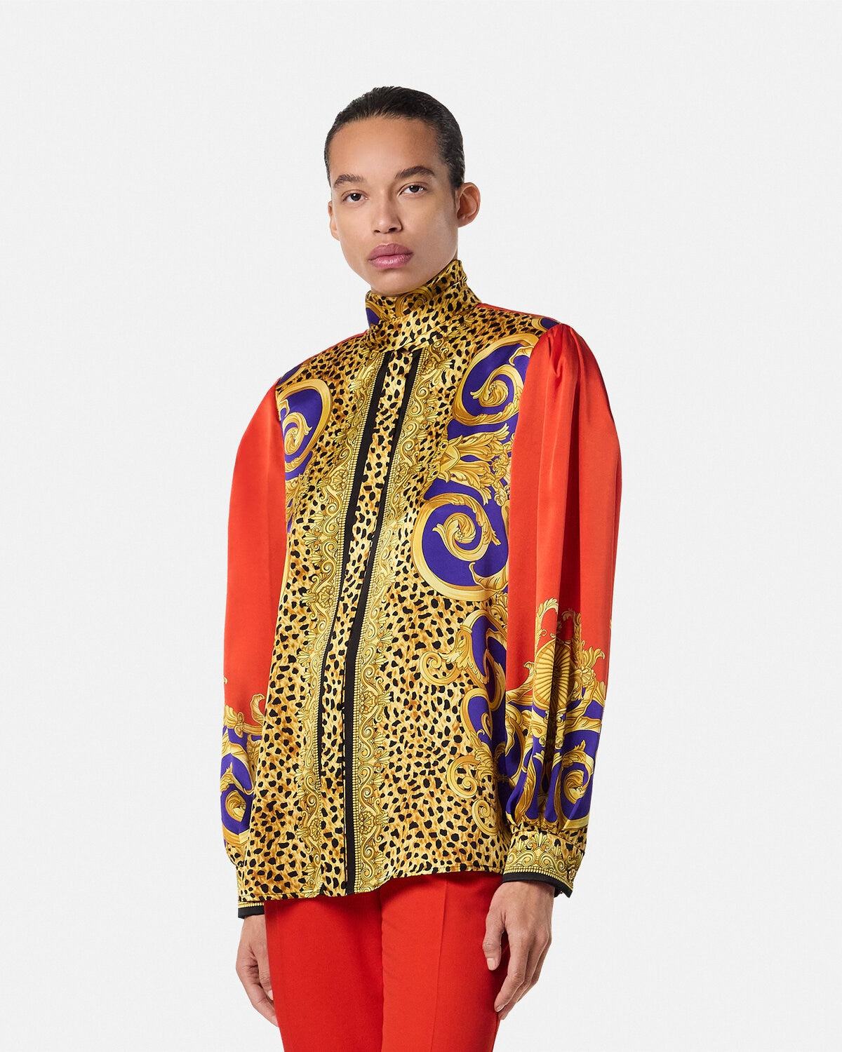 A shirt featuring an animalier pattern with Barocco motifs and pouf long sleeves. The style is complete with Medusa buttons at the cuffs.