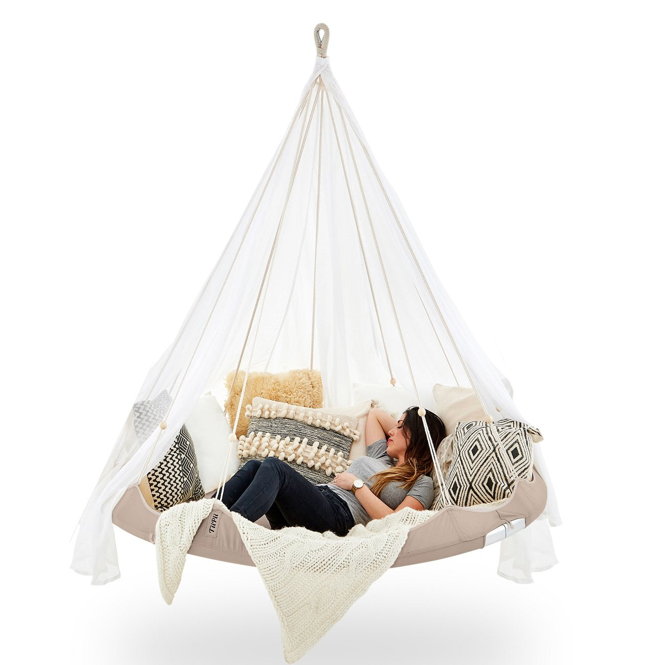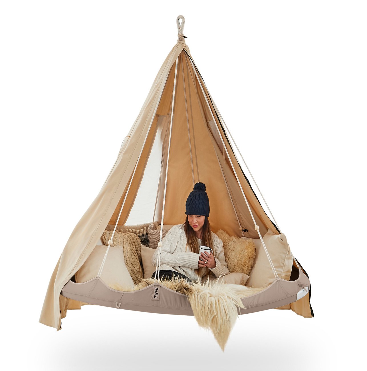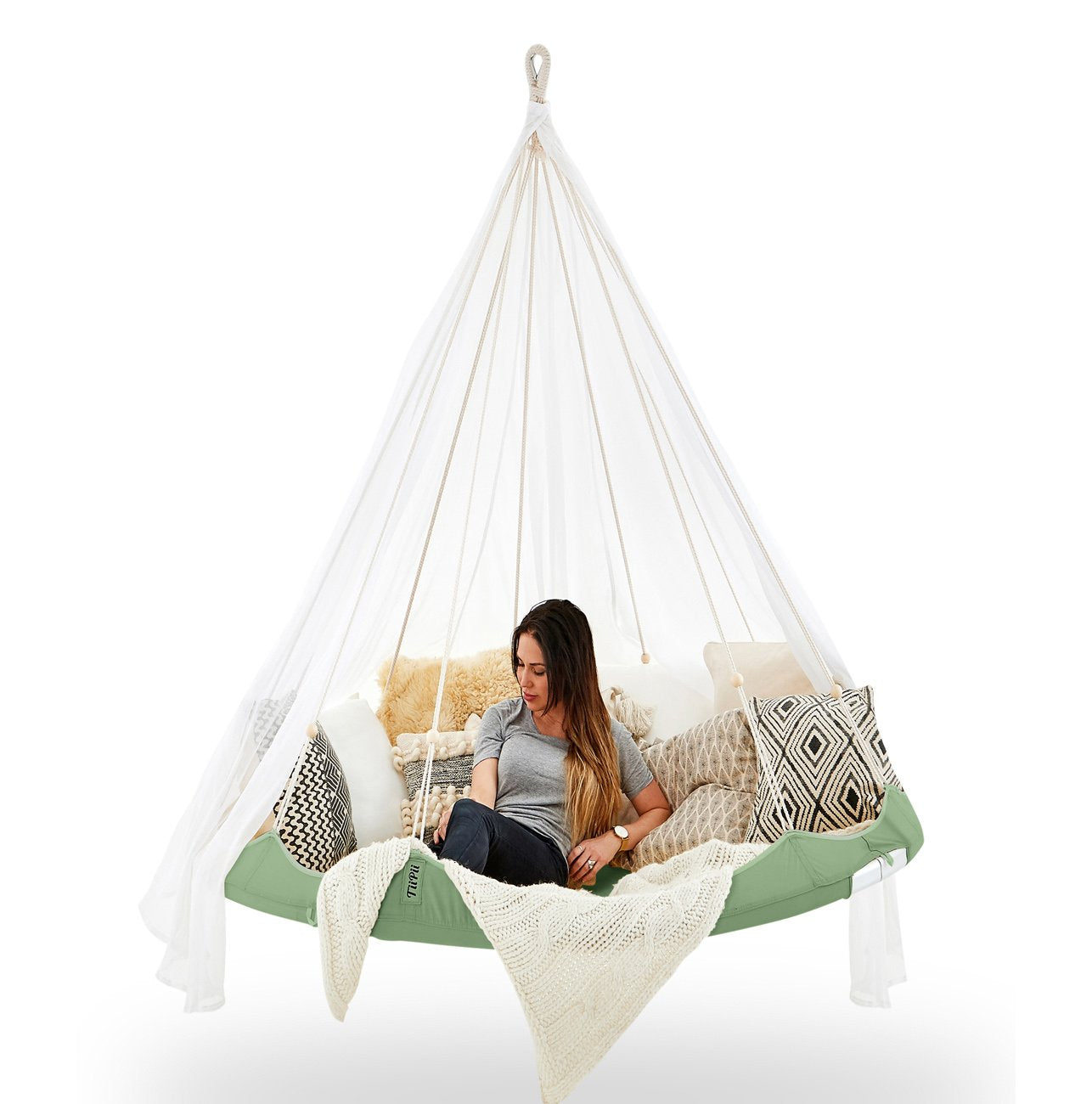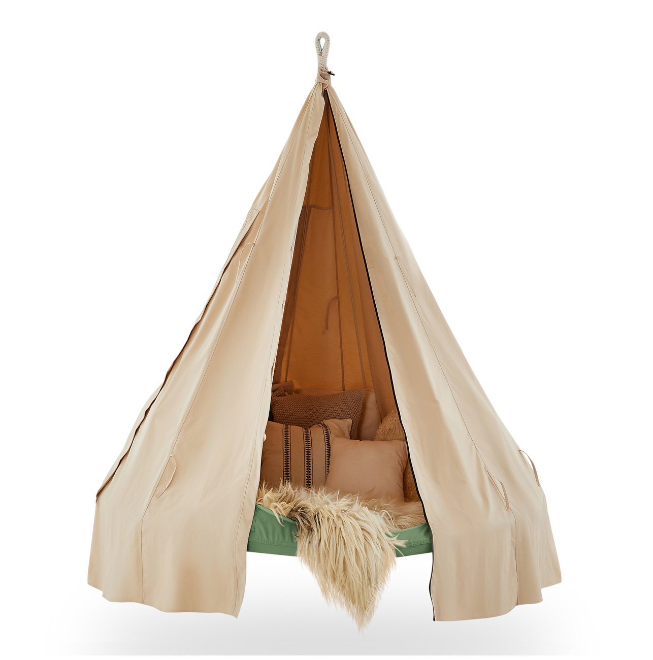 Designed with high-quality soft poly-cotton canvas, macramé finishing touches, and a cosy attachable white sheer net.