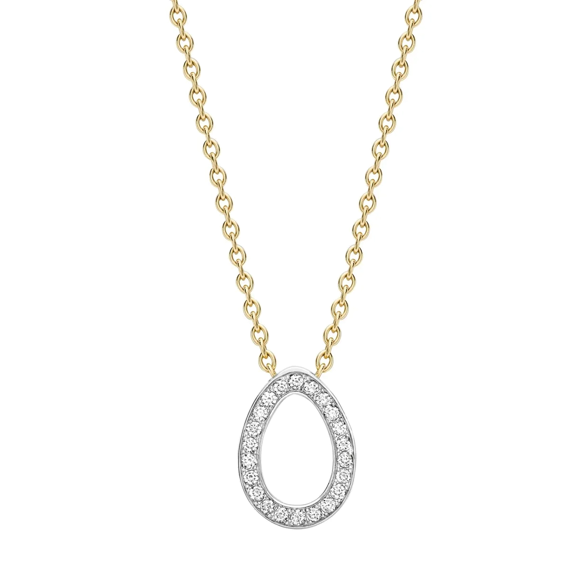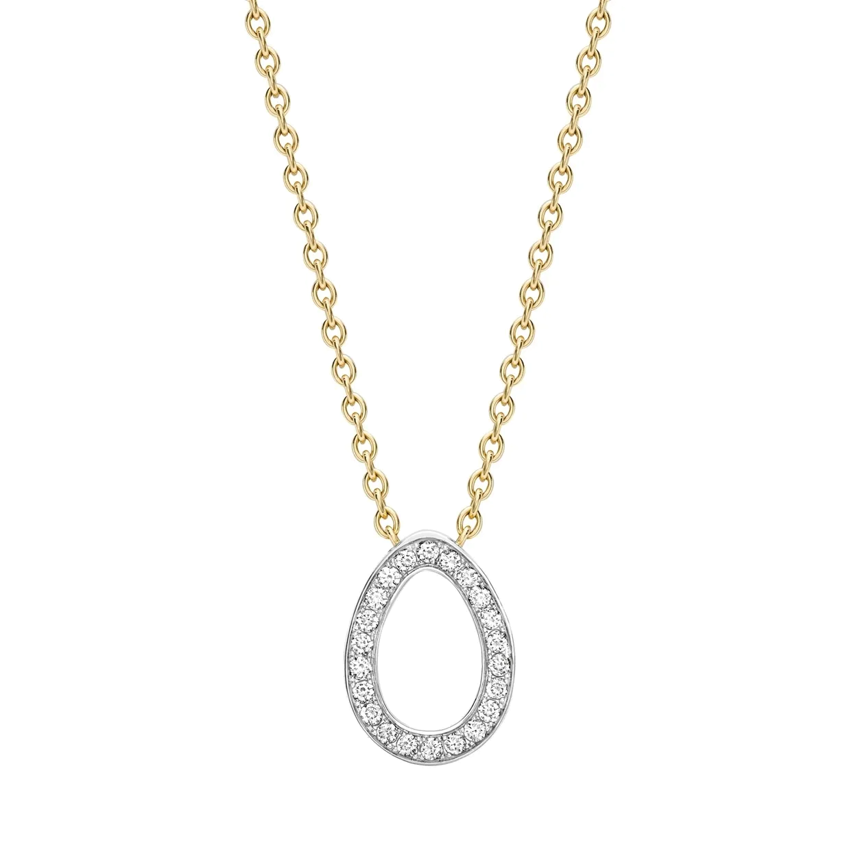 The Sasha pieces depicts the iconic egg silhouette in a contemporary way. This elegant Colours of Love Sasha Yellow , White Gold Diamond Egg Pendant features 22 pavé set round brilliant cut white diamonds. The pendant chain is set in 18 karat yellow gold whilst the diamond egg is set in 18 karat white gold. The diamond egg is 12x9mm in size and the chain is 45cm in length. In keeping with Fabergé's fondness for delight and surprise, a hidden Mozambican ruby can be found at the back of the pendant.