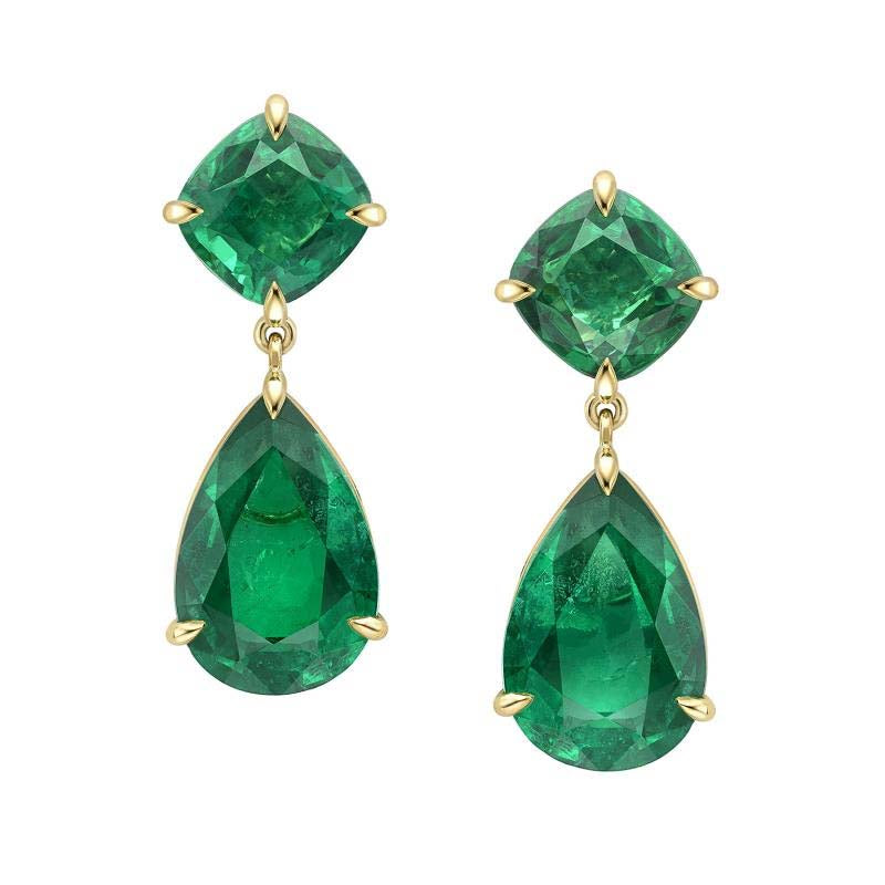These Colours of Love Yellow Gold Emerald Cushion and Pear Shaped Drop Earrings feature 2 cushion cut Gemfields Zambian emeralds and 2 pear shaped Gemfields Zambian emeralds set in 18k yellow gold.