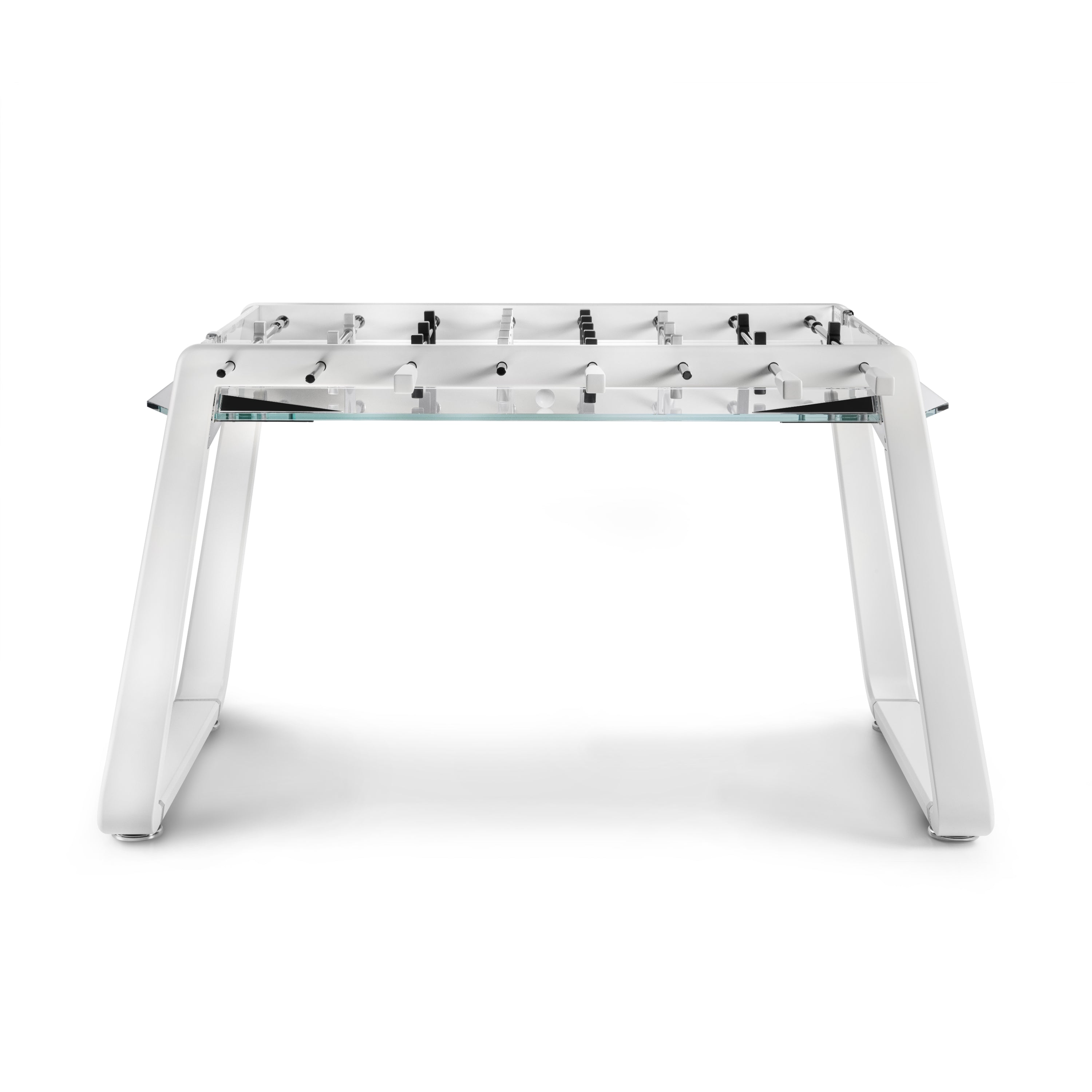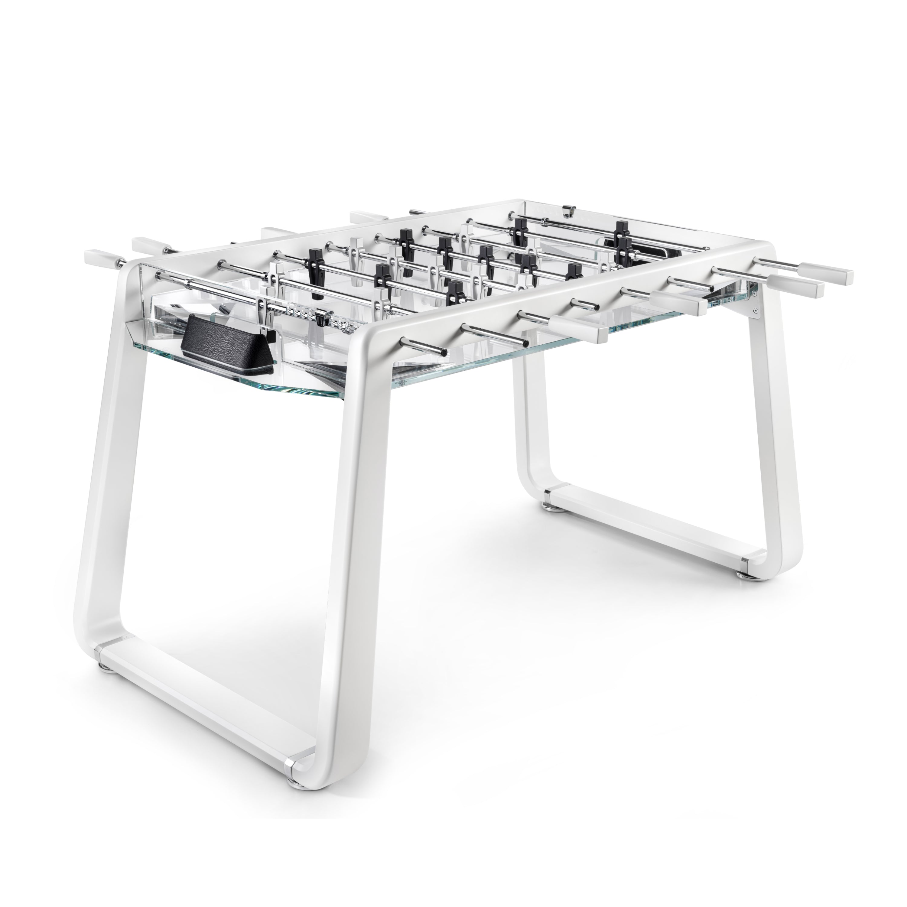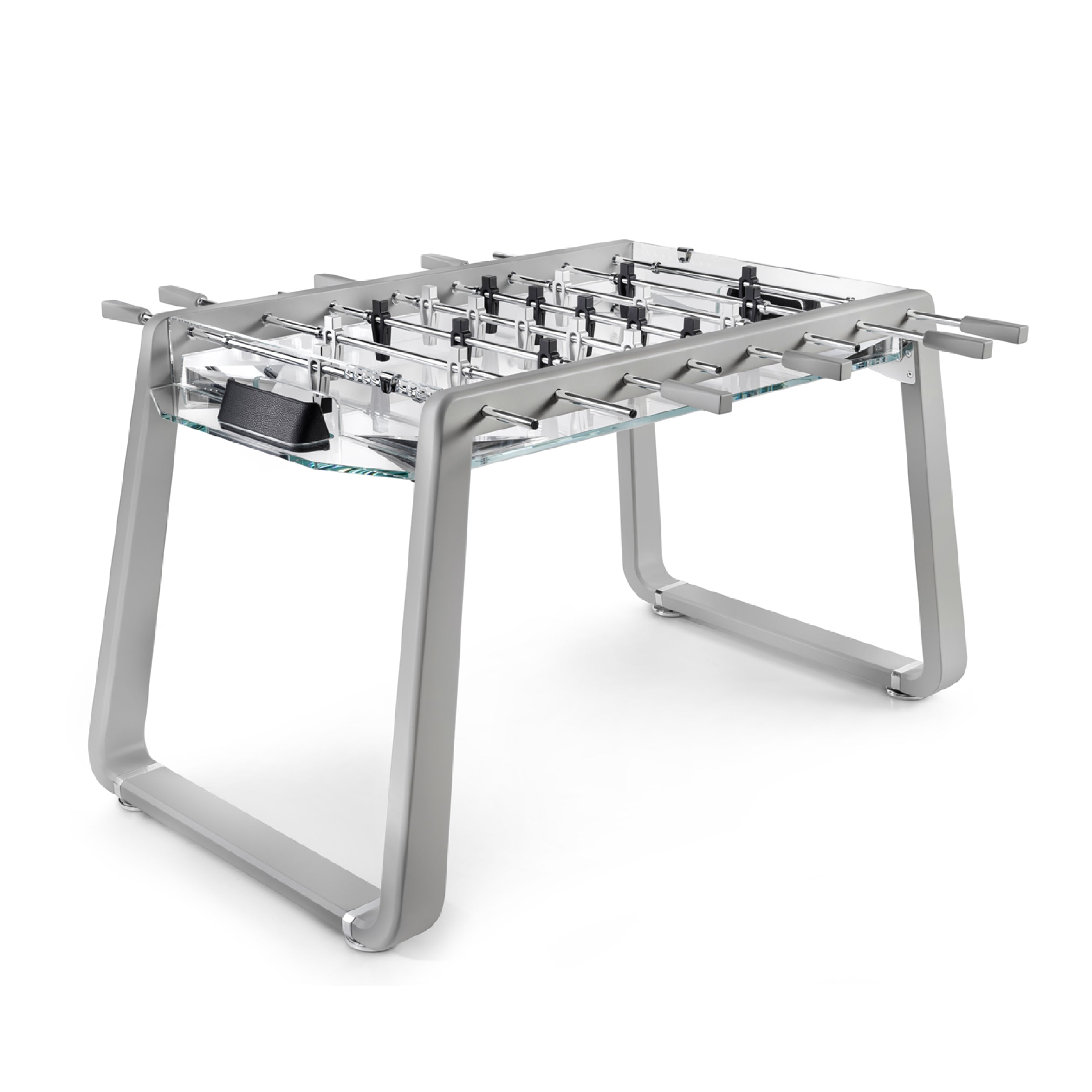 The Derby Canvas is a contemporary foosball table with a harmonious blend of customizable materials. The refined piece features a crystalline low-iron glass playing field, supported by a modern solid lacquered wood structure.
