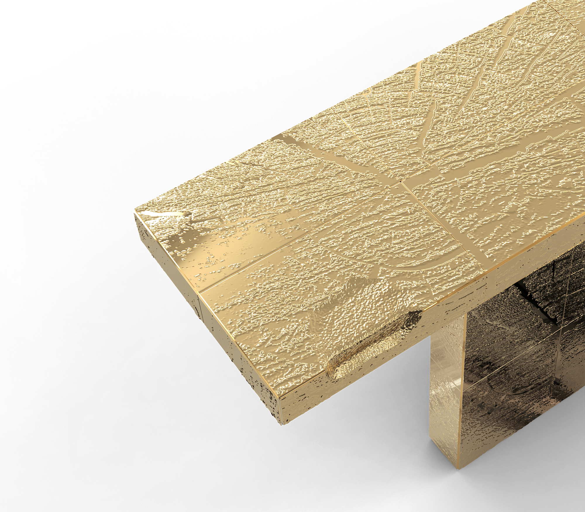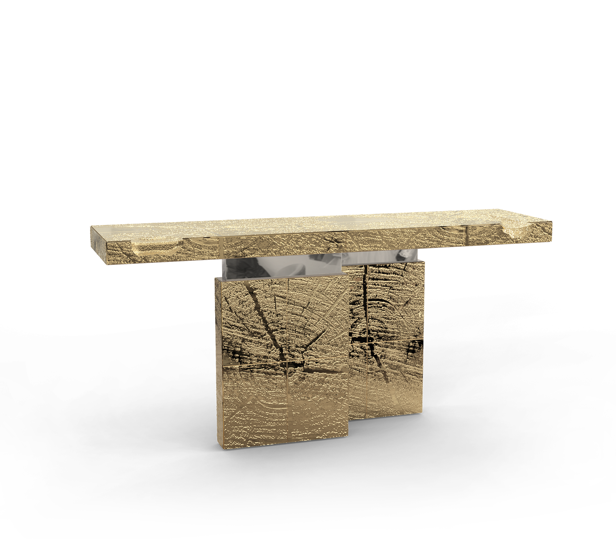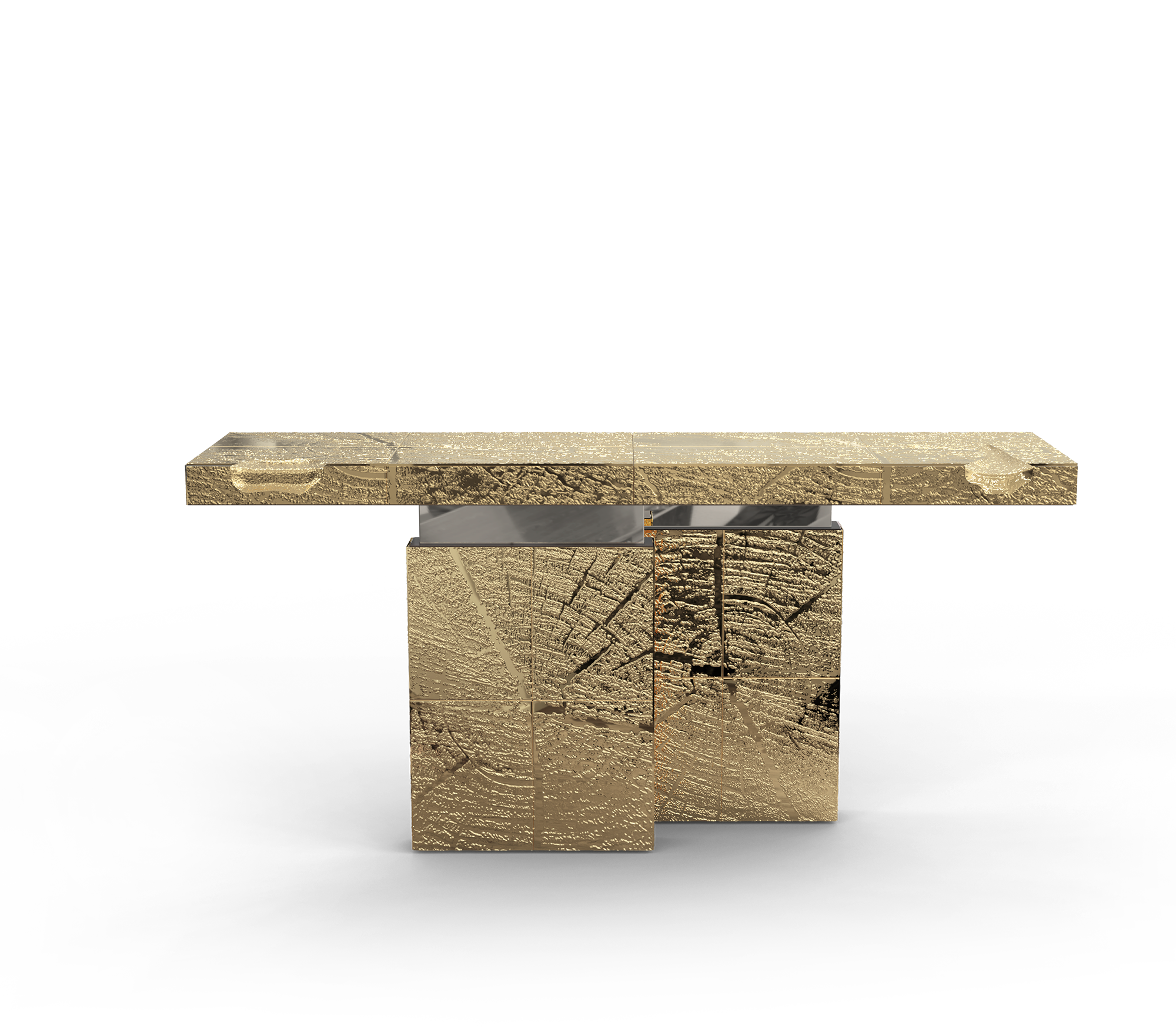 An elegant and contemporary console composed of a rectangular casted brass top and two rectangular casted brass legs with polished hammered brass details, connected by Polished Stainless Steel.