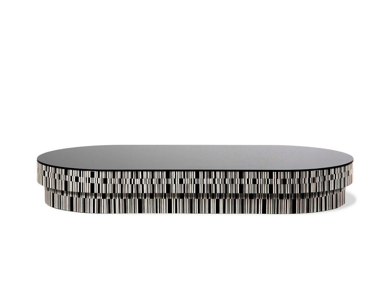 The structure of Enigma coffee table is upholstered with wood, processed with cross-grain inlay with white and black shades that alternate in an irregular way. It presents matt Matrix finish and the black glass top.