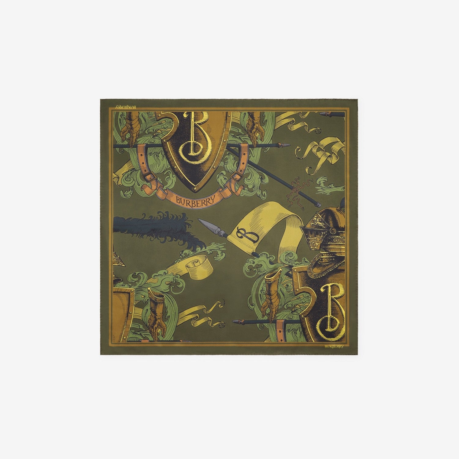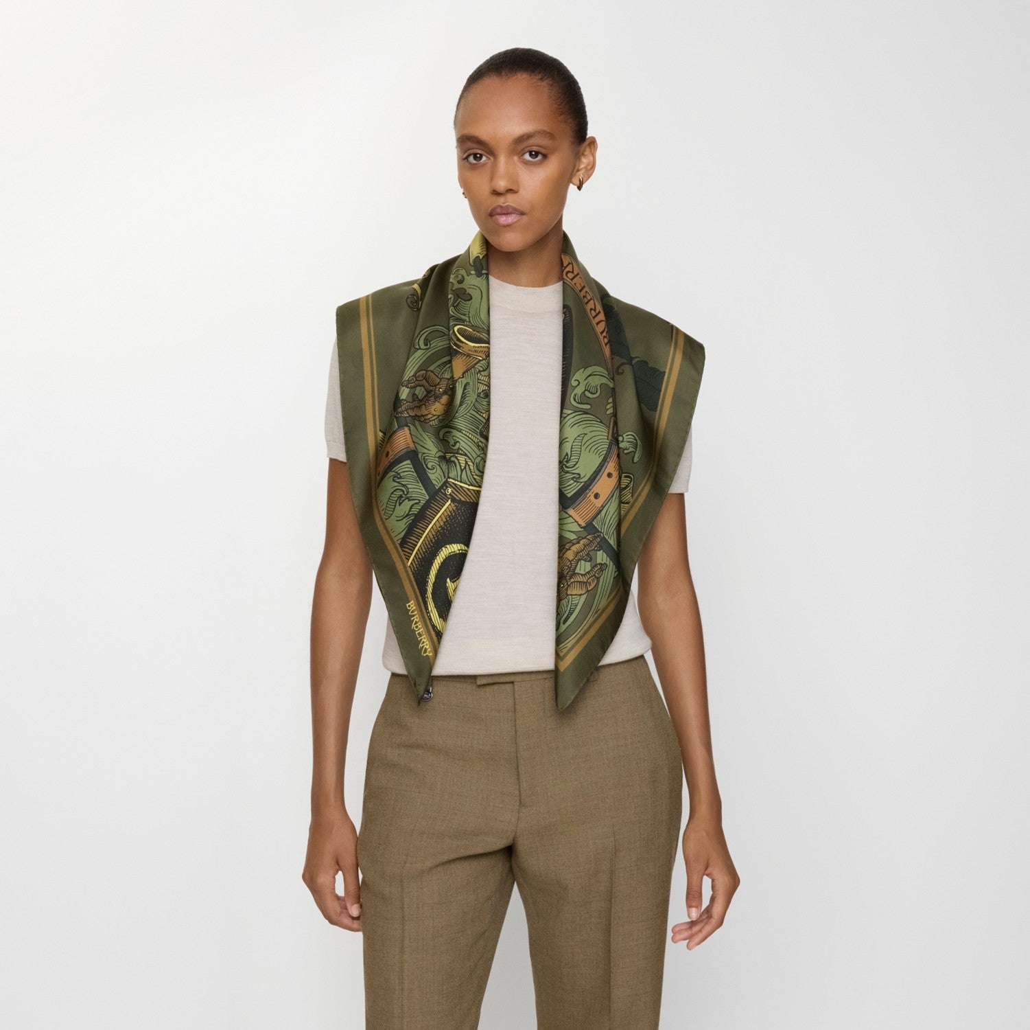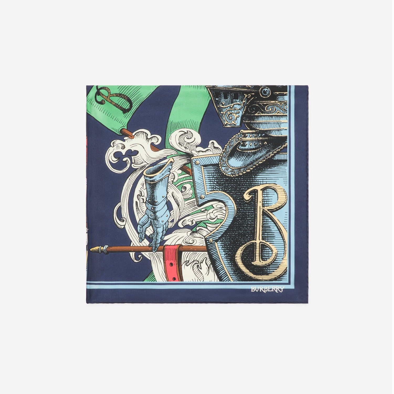 A scarf made in Italy from silk twill, printed with artwork depicting elements from our Equestrian Knight Design. Hand-drawn in the style of antique etchings, the Knight's armour features alongside the B shield and flag.