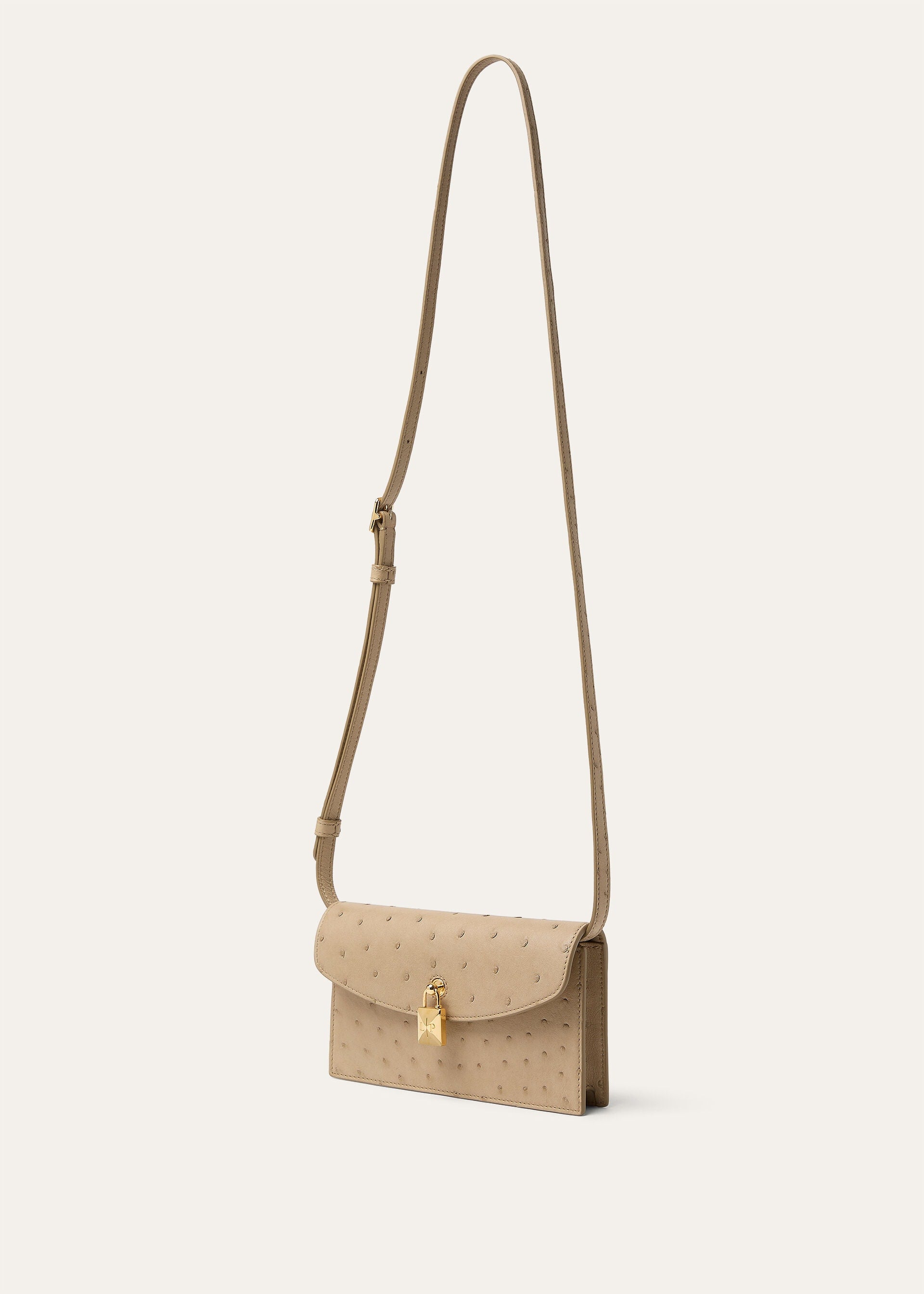 Refined in fabrication and shape, the Extra pochette is a sophisticated companion for the evening. It is cast in precious ostrich leather, expertly worked for an elevated finish. The elegant envelope shape is accentuated with a magnetic padlock clasp in light-catching hardware.