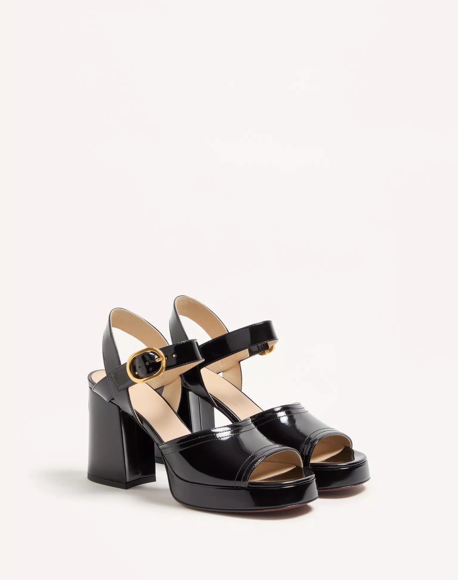 - Platform and wide heel wrapped in polished calfskin