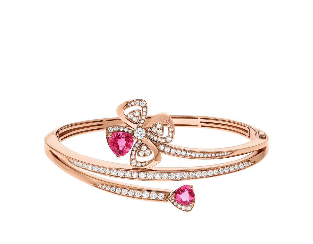 Blooming with its gem-set corolla, the Fiorever 18 kt rose gold bracelet draws inspiration from the alluring four-petal flower cherished by the Romans as a symbol of happiness and joy. Embellished with the timeless elegance of precious diamonds, the floral motif is animated by Bvlgari's signature touch of colour, with two rubellite petals creating a beautiful interplay of volumes, shapes and reflections.