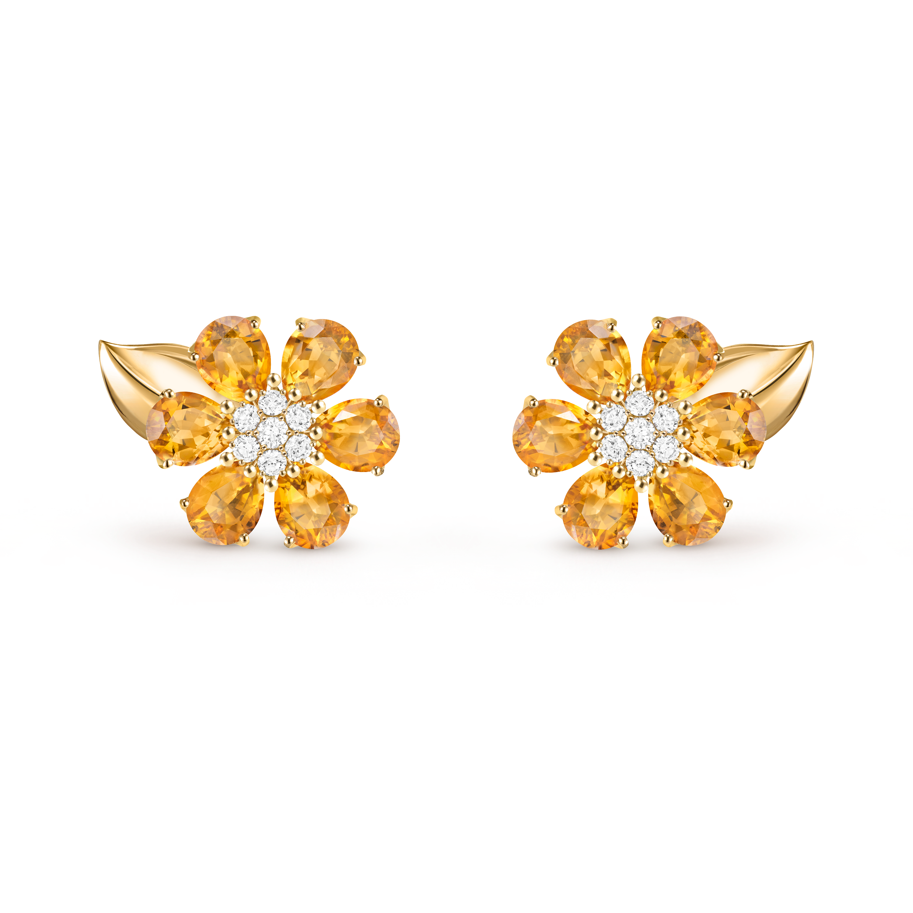 Fleurs d’Hawaï earrings, small model, 18K yellow gold, peridots, round diamonds; diamond quality DEF, IF to VVS.