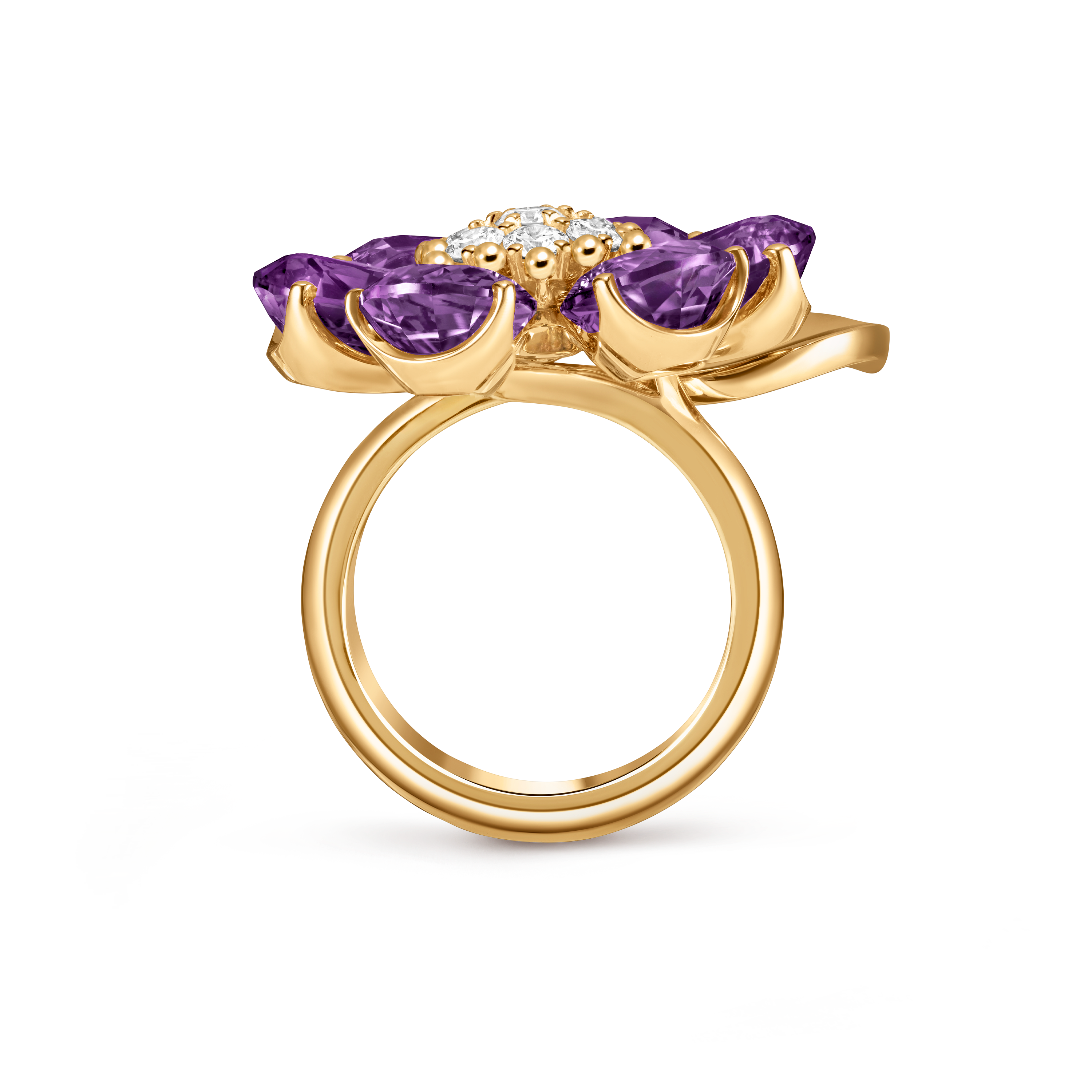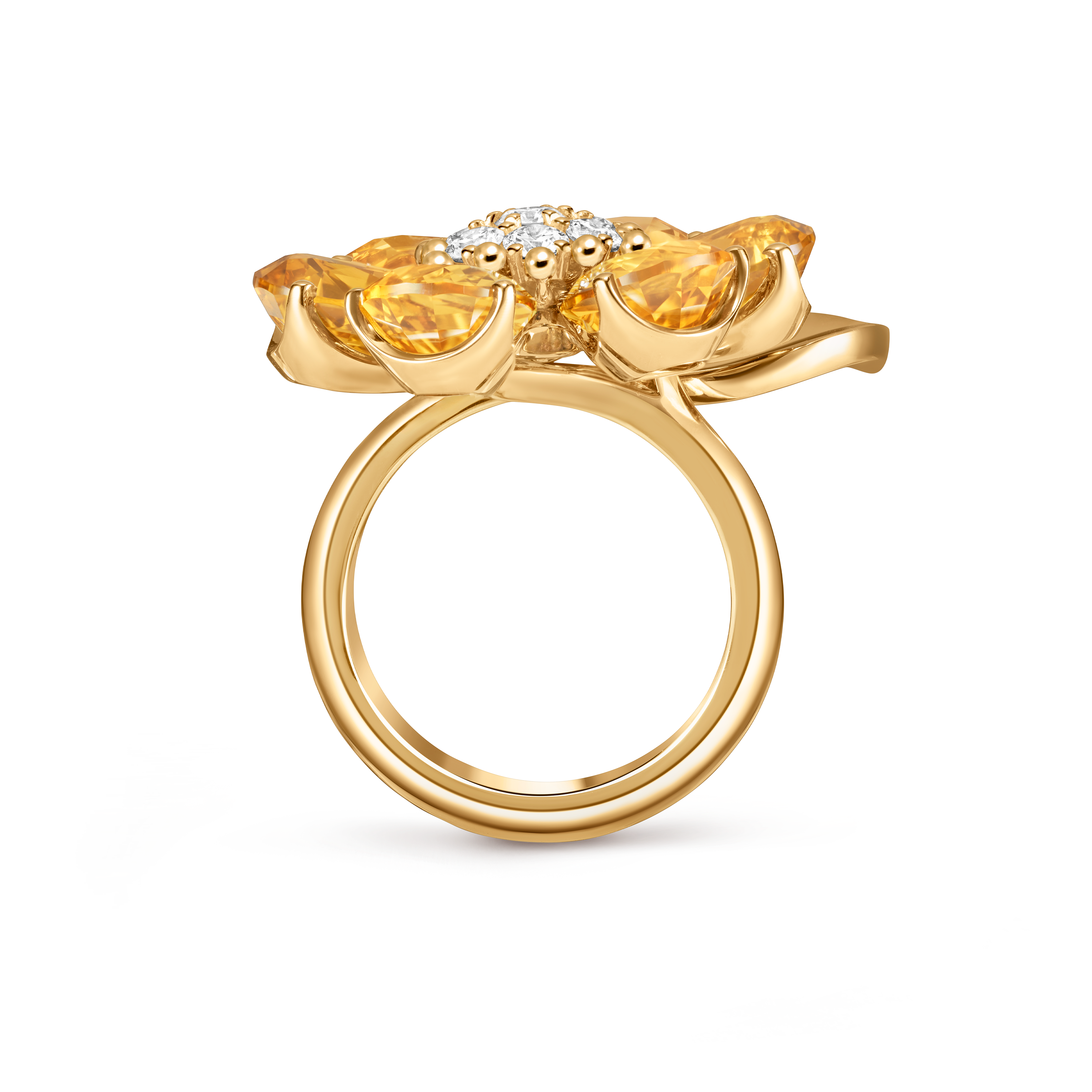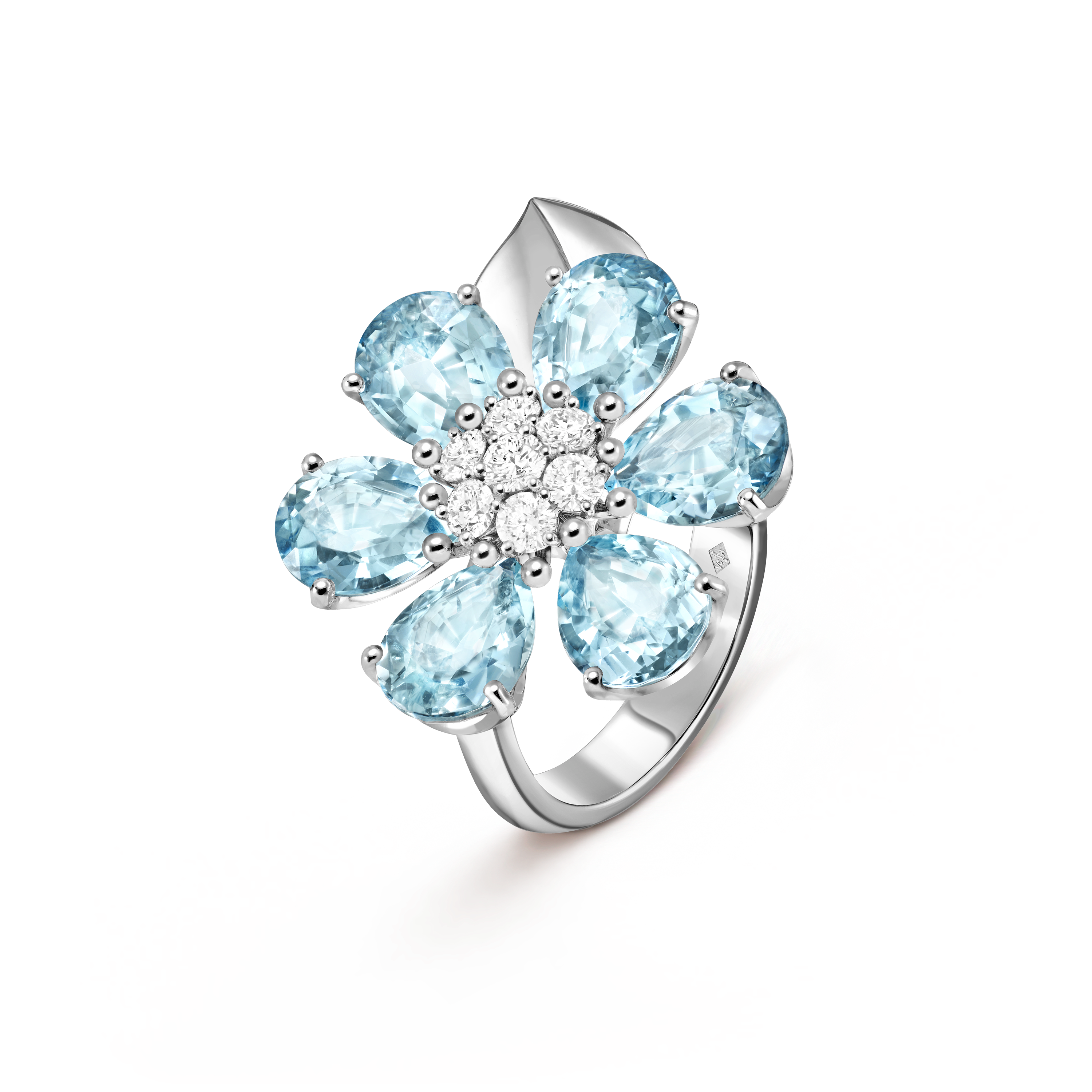 Fleurs d’Hawaï ring, large model, 18K white gold, aquamarines, round diamonds; diamond quality DEF, IF to VVS.
