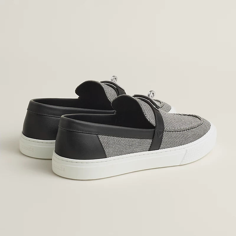 Loafer style slip-on sneaker in H Maxi canvas and calfskin with functional Kelly buckle.
