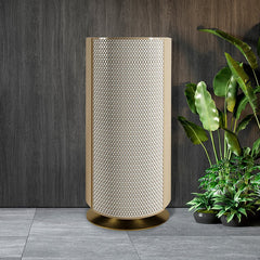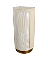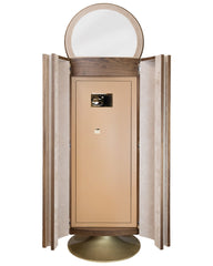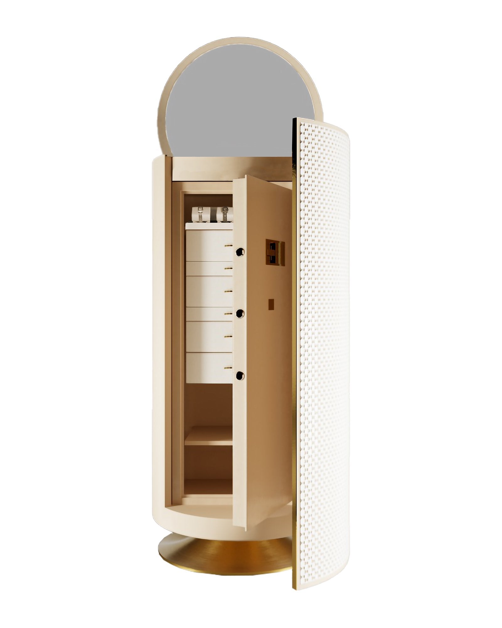 Our secure jewelry chest combines safety and refinement. Its curved design is hand-covered in white and beige leather, highlighting exquisite craftsmanship. The touchscreen numeric keypad ensures convenience and discretion, while the gold-finished base and accessories add a touch of understated elegance. A perfect blend of sophisticated design and discreet security.