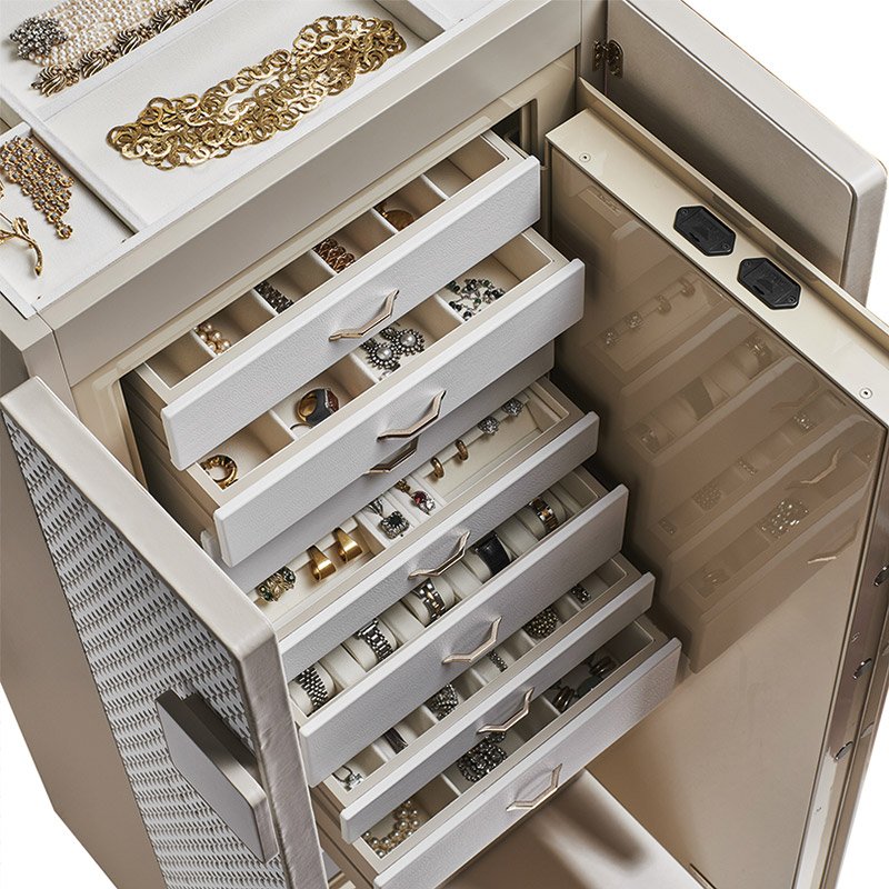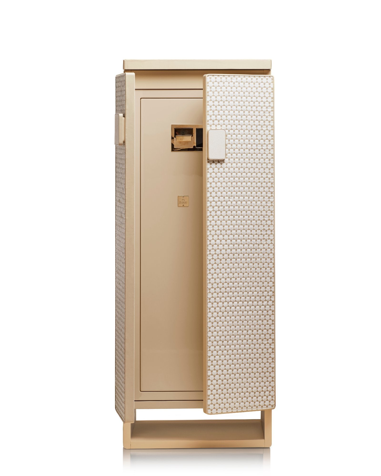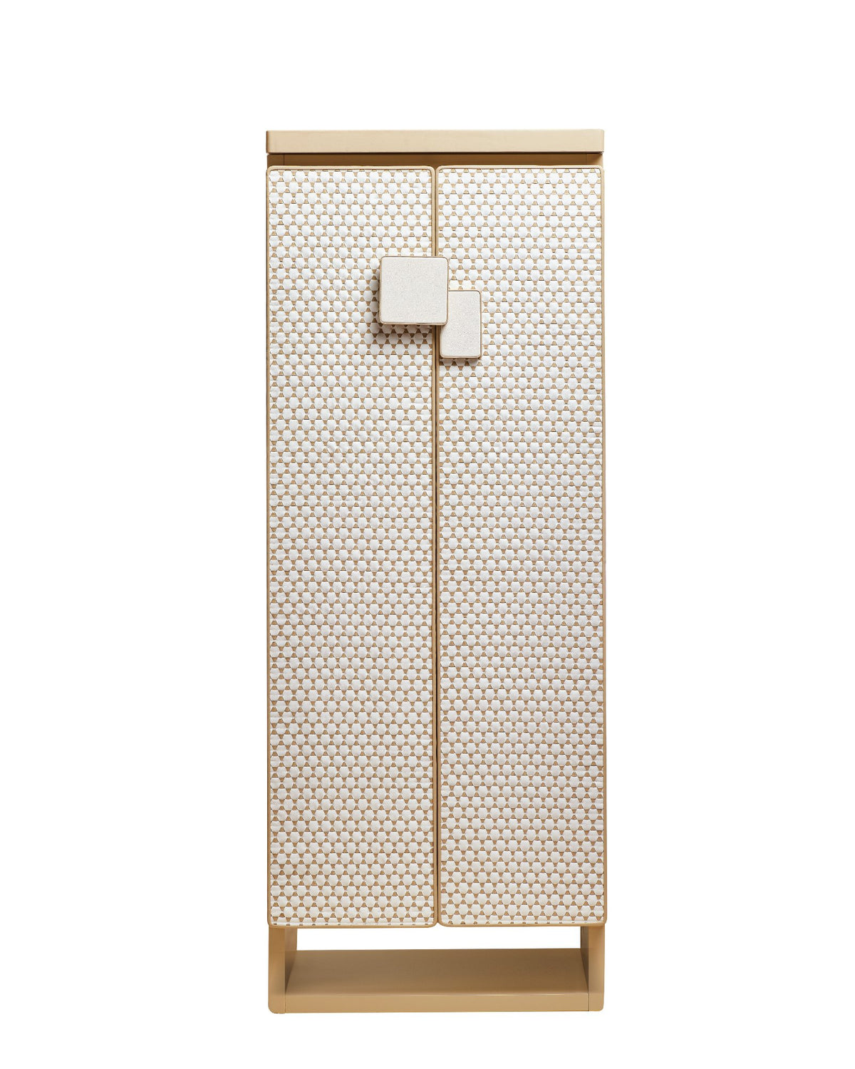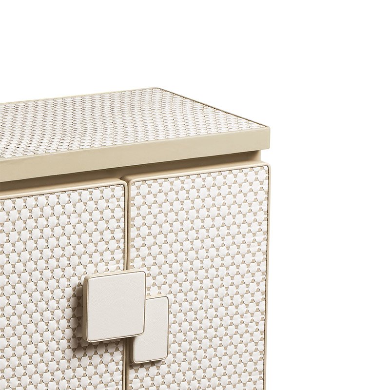 An armoire with safe that perfectly combines elegance, refined design, and Italian craftsmanship. The front doors are covered in hand threaded white and beige leather. The woven texture, inspired by classic patterns from Italian tradition, gives the product a sophisticated and timeless look. The accessories are made of 24-karat gold-plated brass.