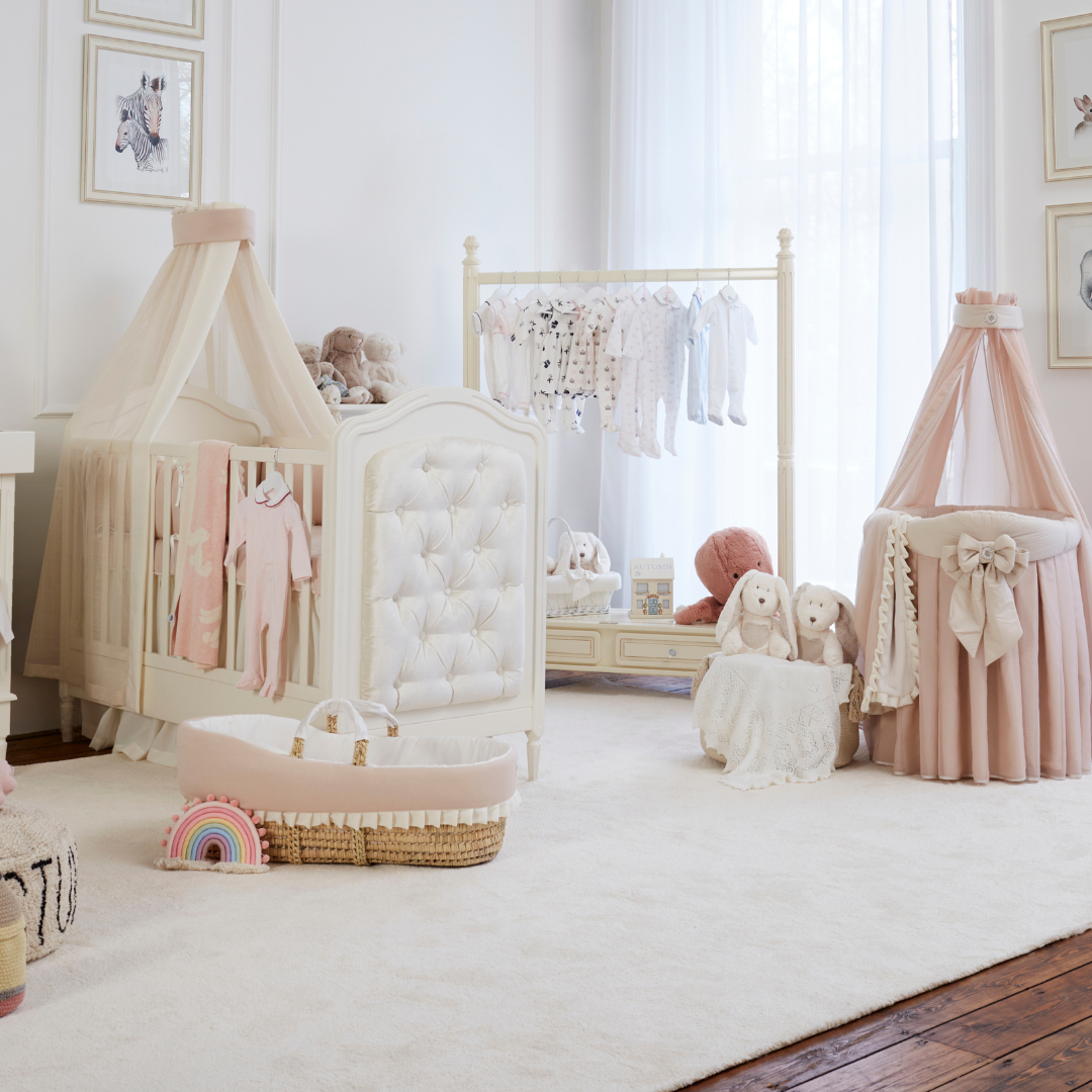 The Grace Rose Moses Basket is the most elegant first bed for your newborn baby. With a subtle blush fabric and elegant frills, the baby Moses Basket is designed in soft cotton. Complete with a quilt, pillow and fitted sheet, it looks truly magnificent in a baby nursery or at your bedside. The cushioned interior promises to keep your little bundle cosy and warm – just what they need to feel secure as they doze off to sleep.