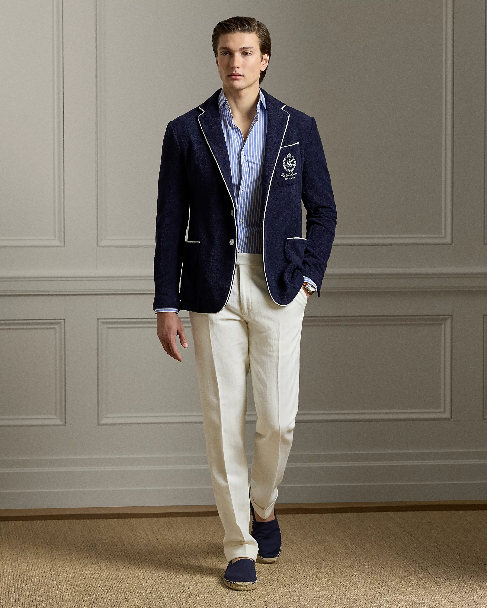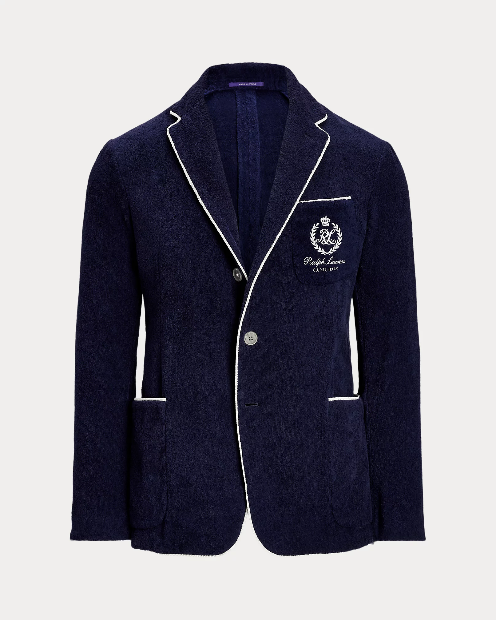 This blazer's plush cotton terry is transformed through masterful Italian hand-tailoring to create a statement of sophisticated ease. Our signature metal buttons and embroidered "Ralph Lauren" crest perfectly balances heritage detailing with contemporary comfort.