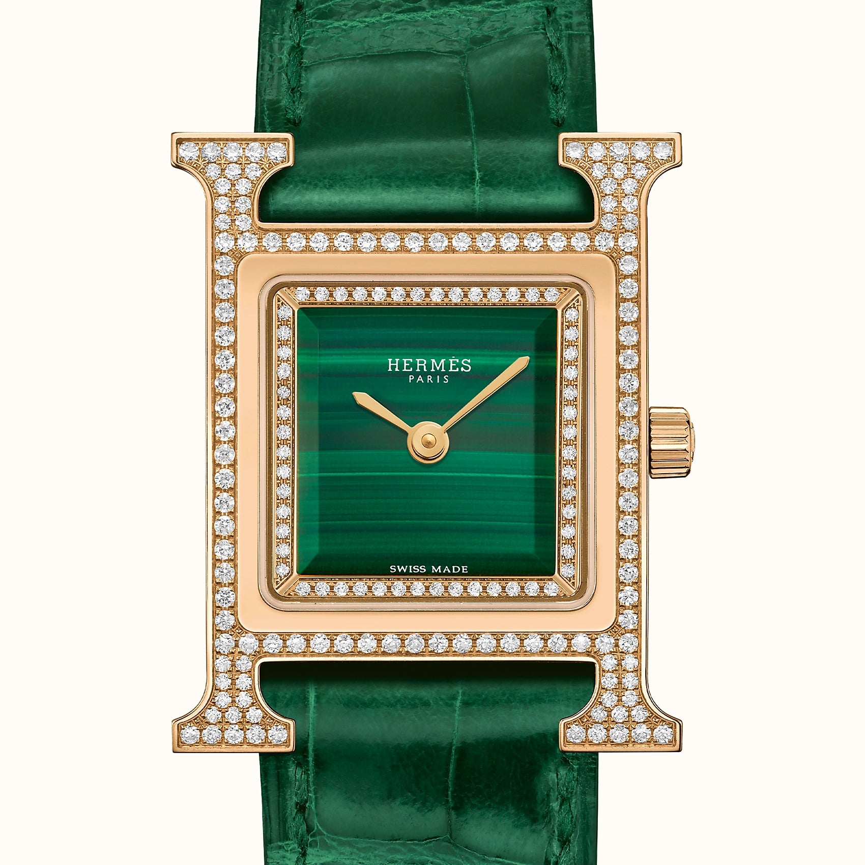 Diamond-set rose gold watch, diamond-set malachite dial, 21 x 21 mm, long interchangeable strap in smooth green alligator