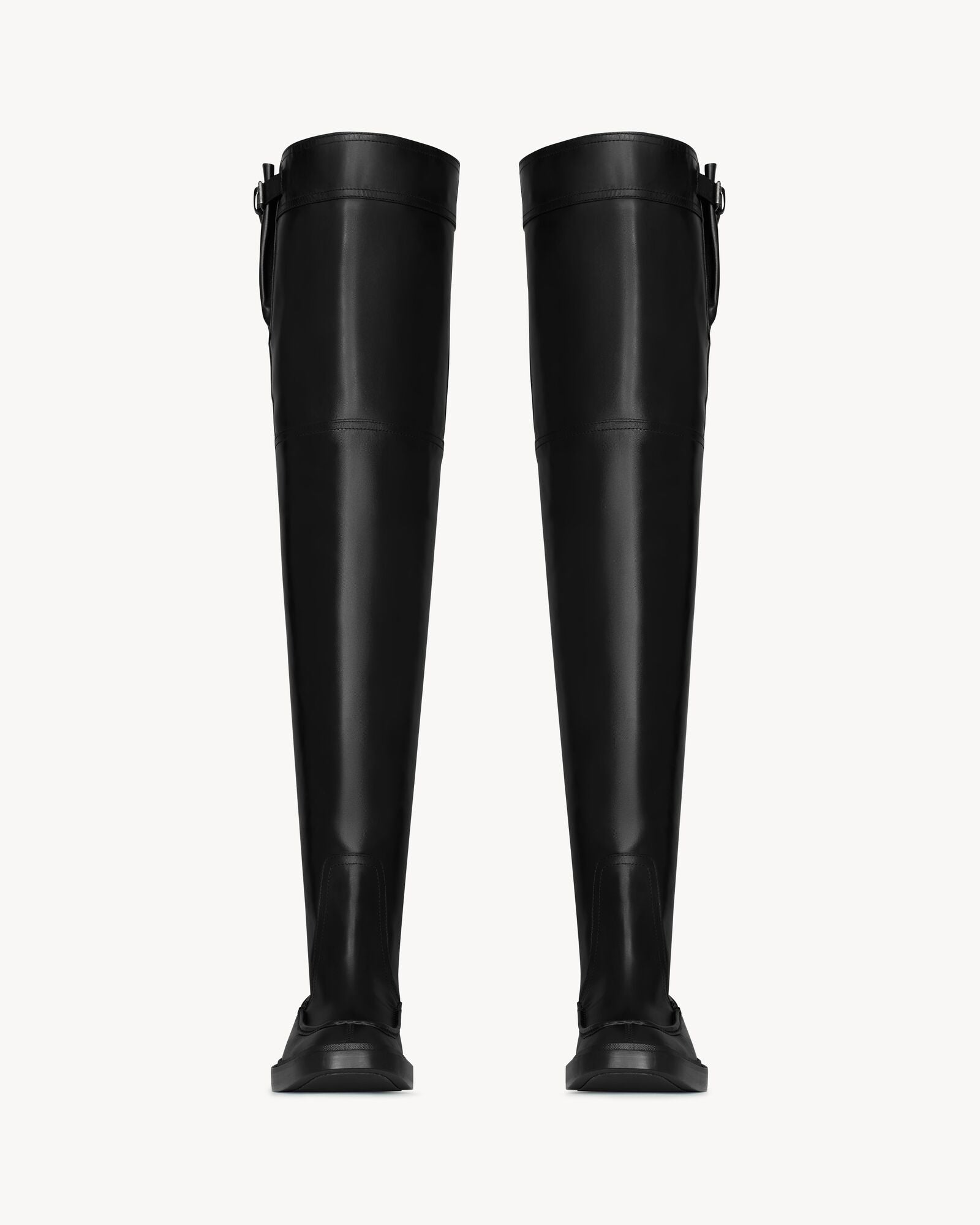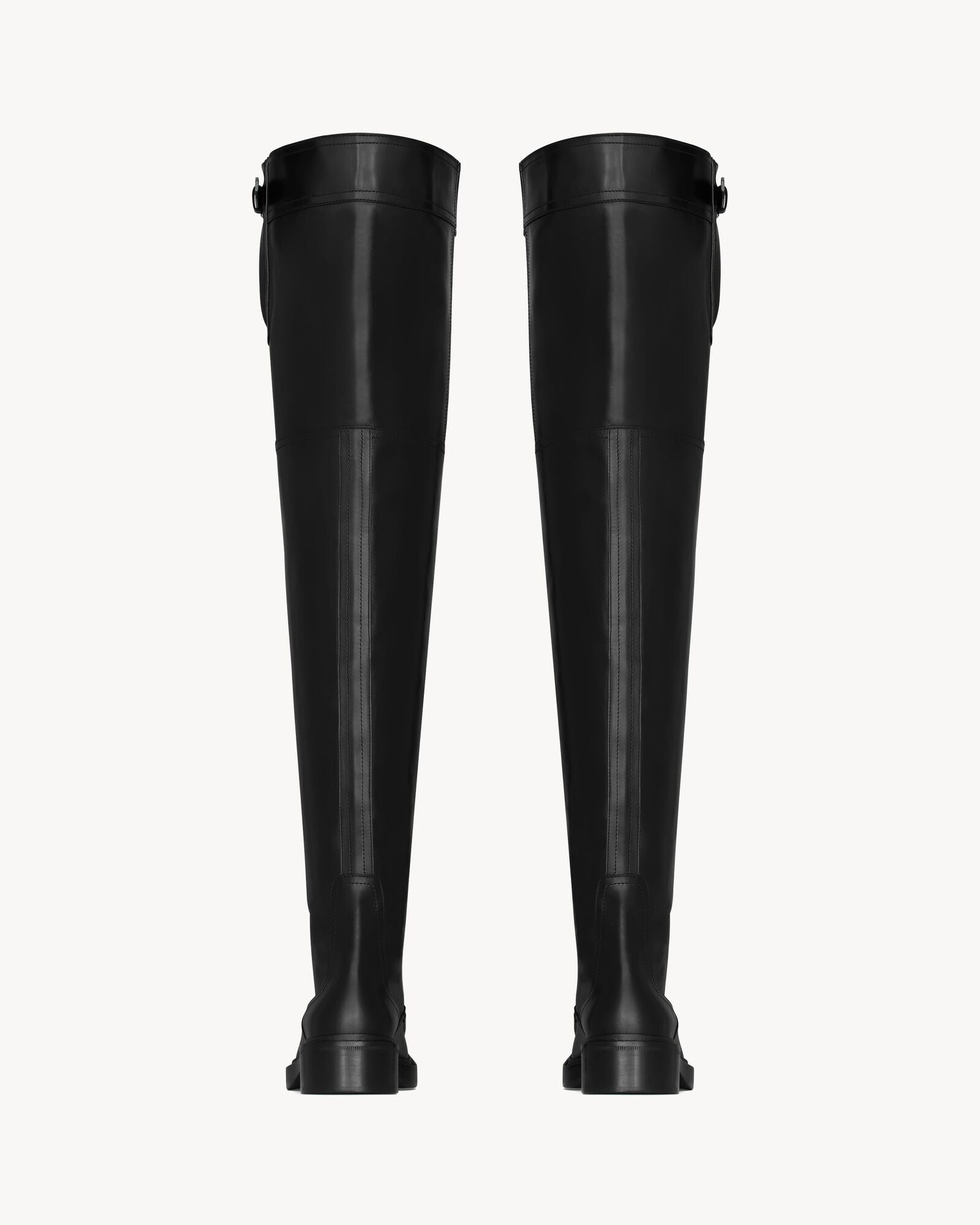 Over-the-knee boots with a squared moc toe, stacked heel, and adjustable buckle at the thigh.