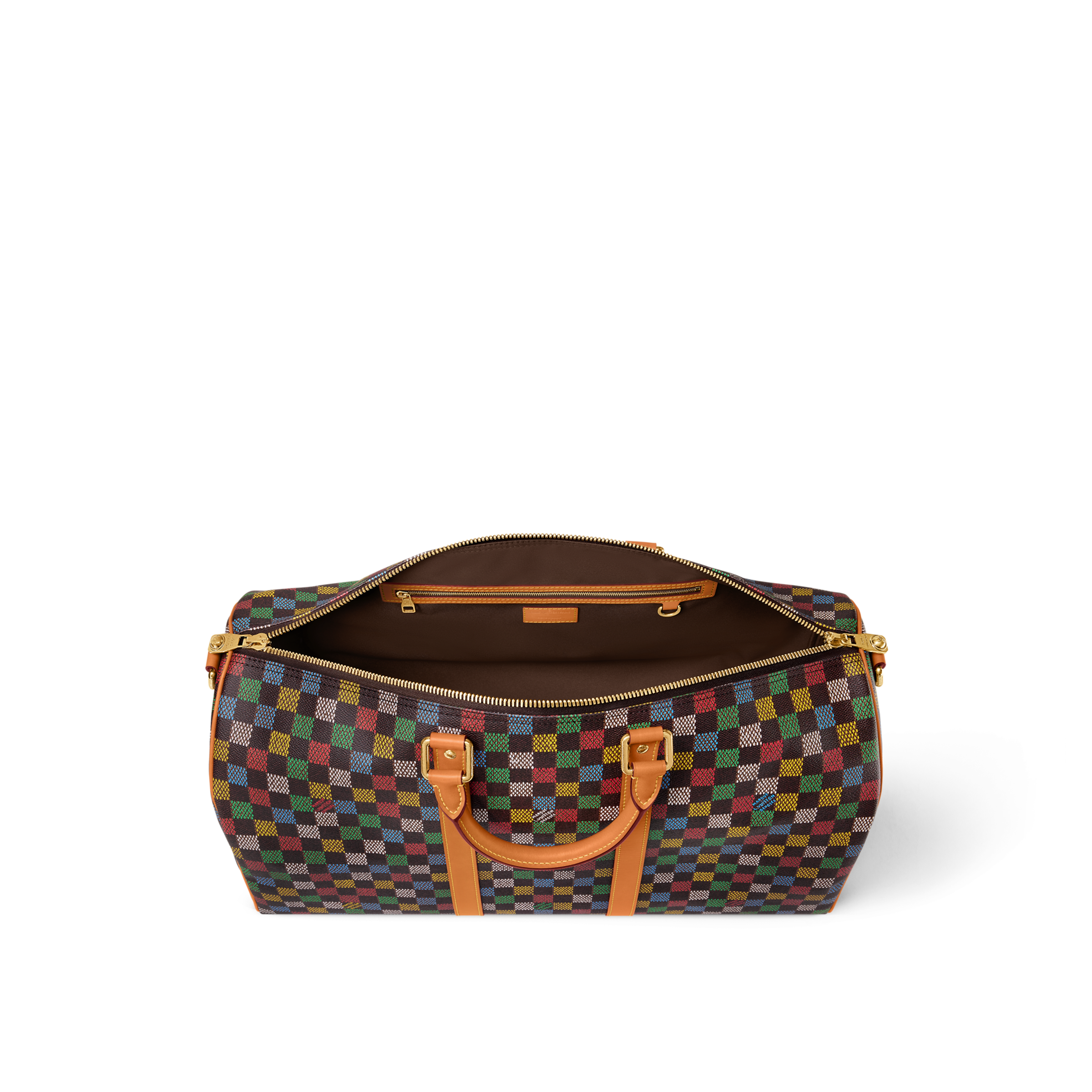 The Keepall Bandoulière 50 travel bag is fashioned from Damier Ebene canvas, on which a multicoloured checkerboard pattern is printed. The pattern is punctuated with 'Marque Louis Vuitton Déposée' in some of the squares. The pearl zip pull and removable leather tag, a cross between a globe and a Monogram Flower, complete Pharrell Williams’ design.