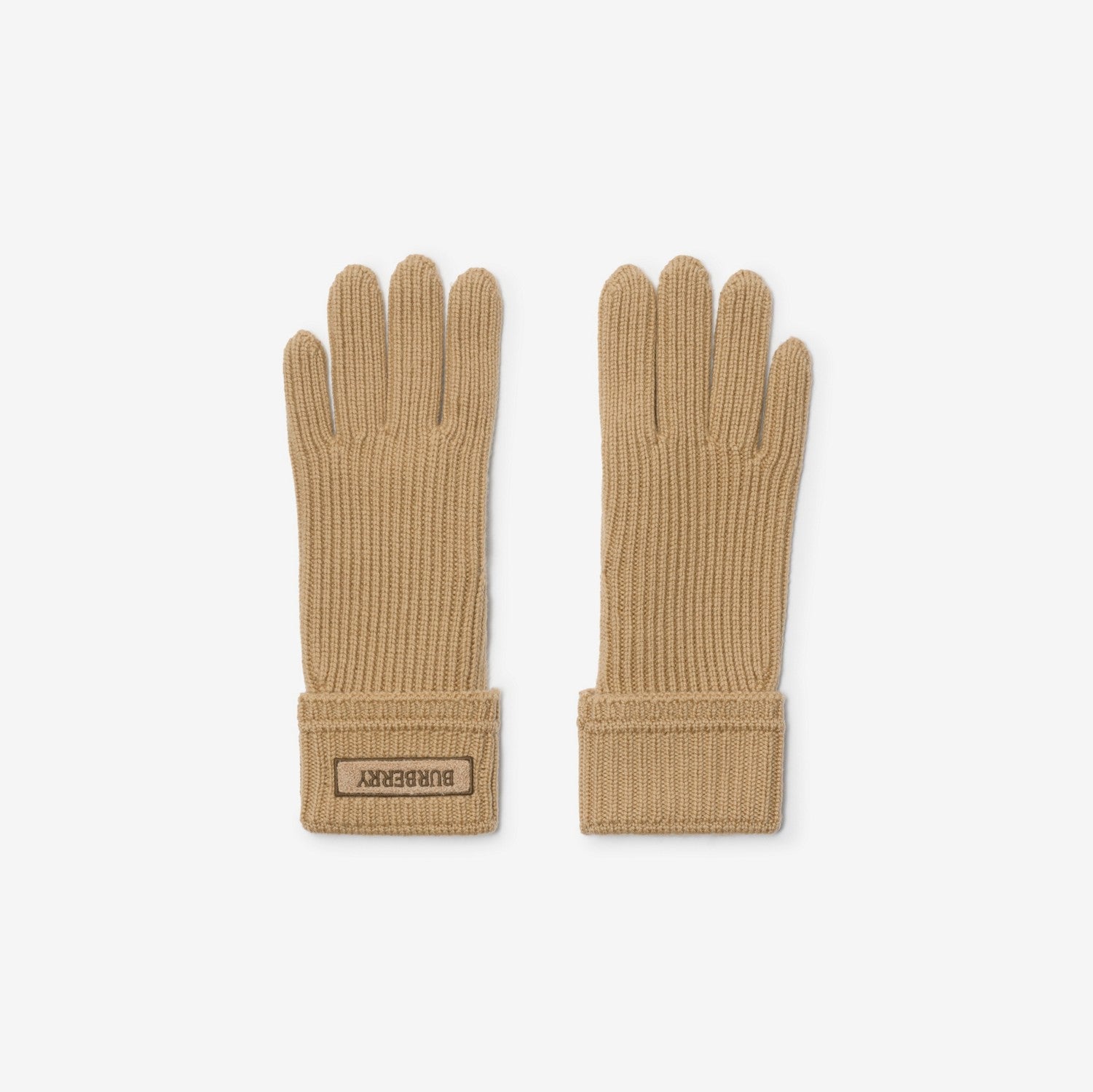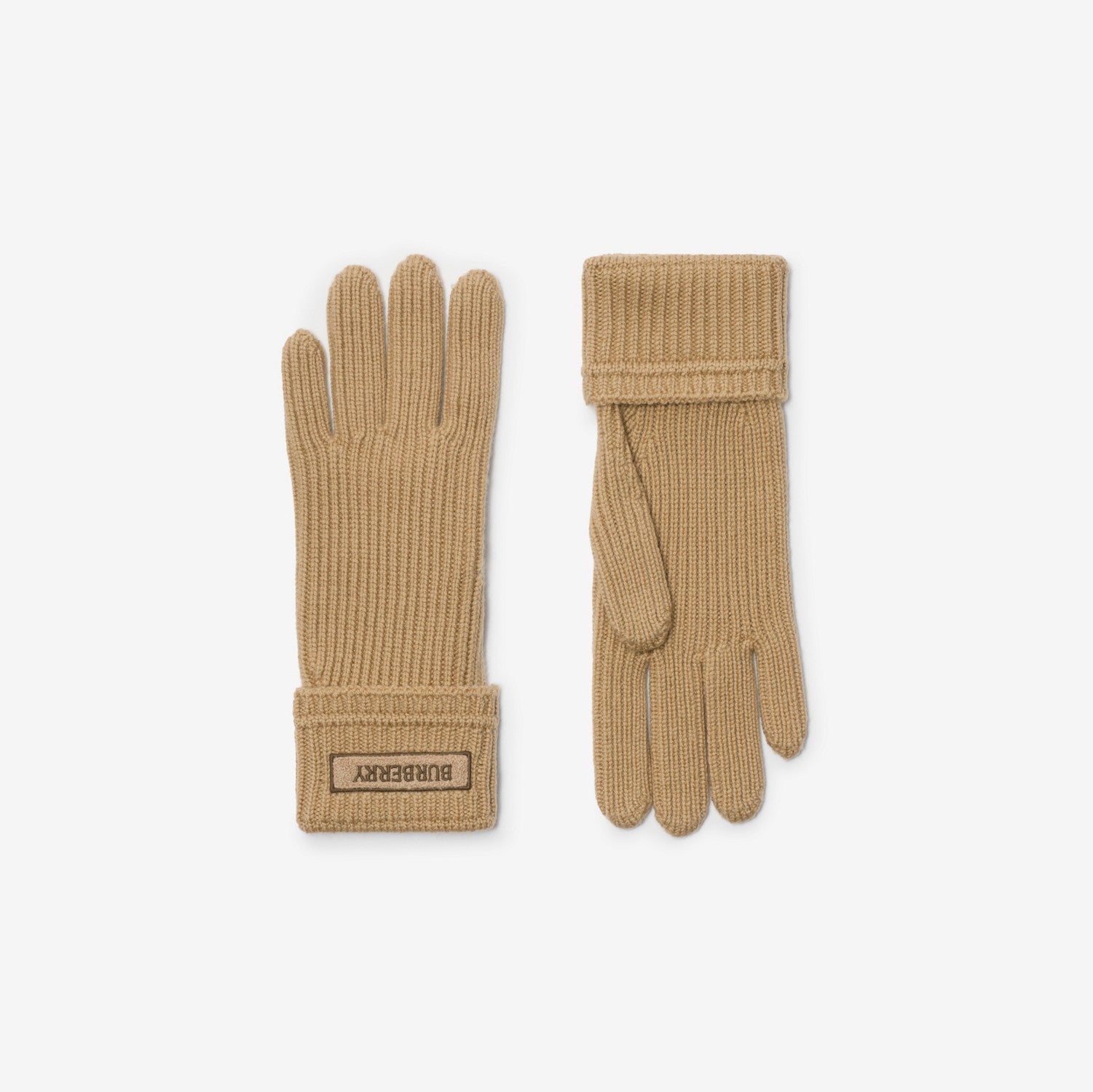 A pair of wool blend gloves, made at a 200-year-old mill in Scotland. The rib-knit style features an appliquéd patch embroidered with our logo.