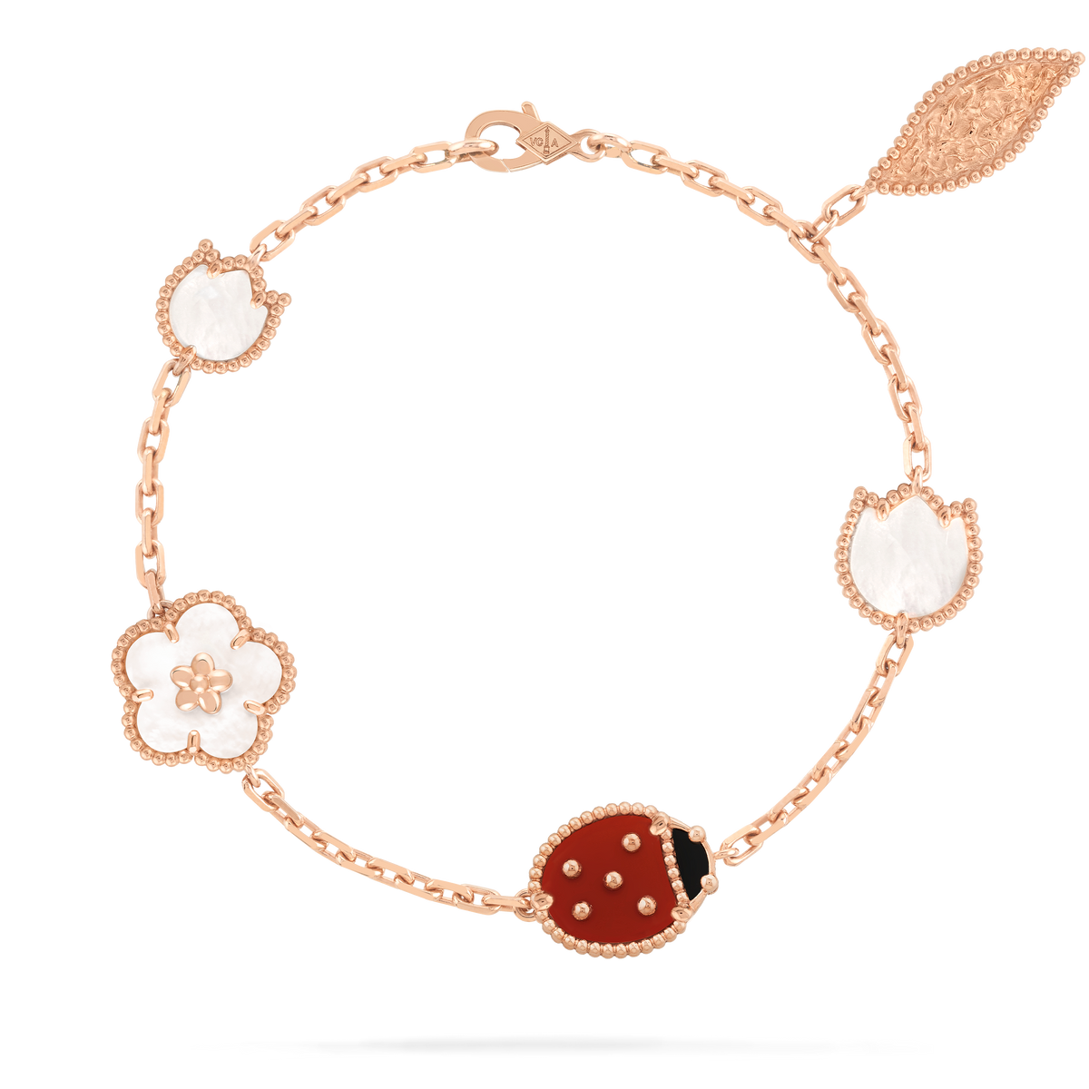 Lucky Spring bracelet, 5 motifs, 18K rose gold, white mother-of-pearl, carnelian, onyx.