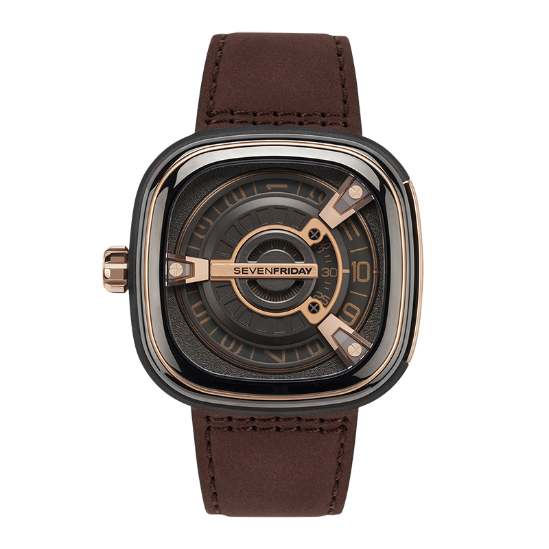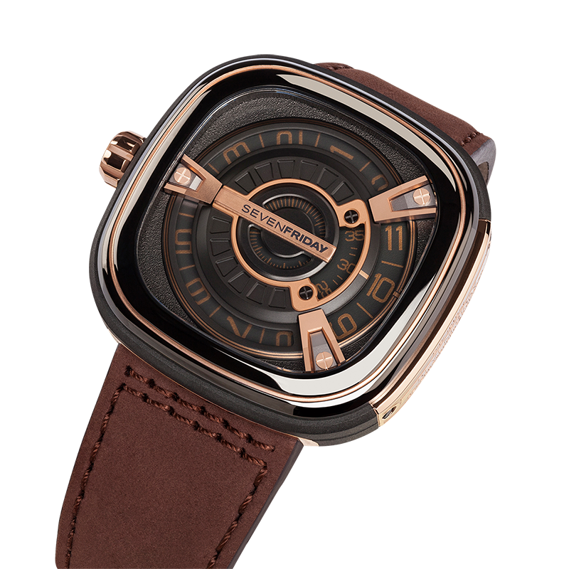 The M2/02 takes inspirations from copper pipes, a quintessential mechanical element during the industrial revolution. Featuring a stainless steel box with rose gold PVD treatment and a polished rose gold PVD identification plate, the M2/02 has a dark grey mirror PVD treated bezel with rose gold highlights. It’s stainless steel animation ring is sandblasted dark grey PVD while the interface is comprised of seven dark grey and rose gold layers, alternately finished in cast iron grain stamped pattern, opalin, matt and satin.