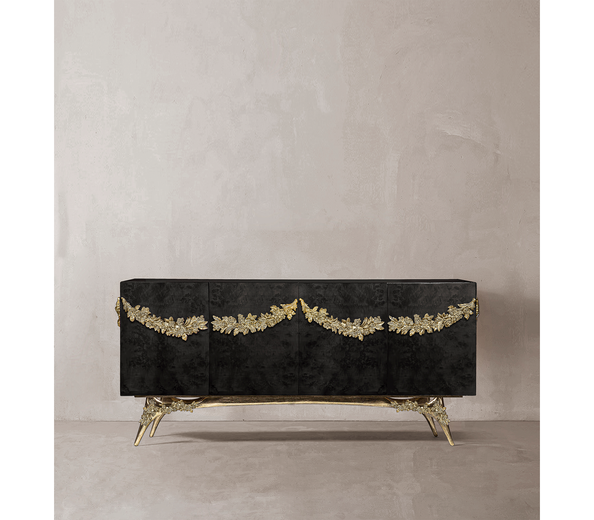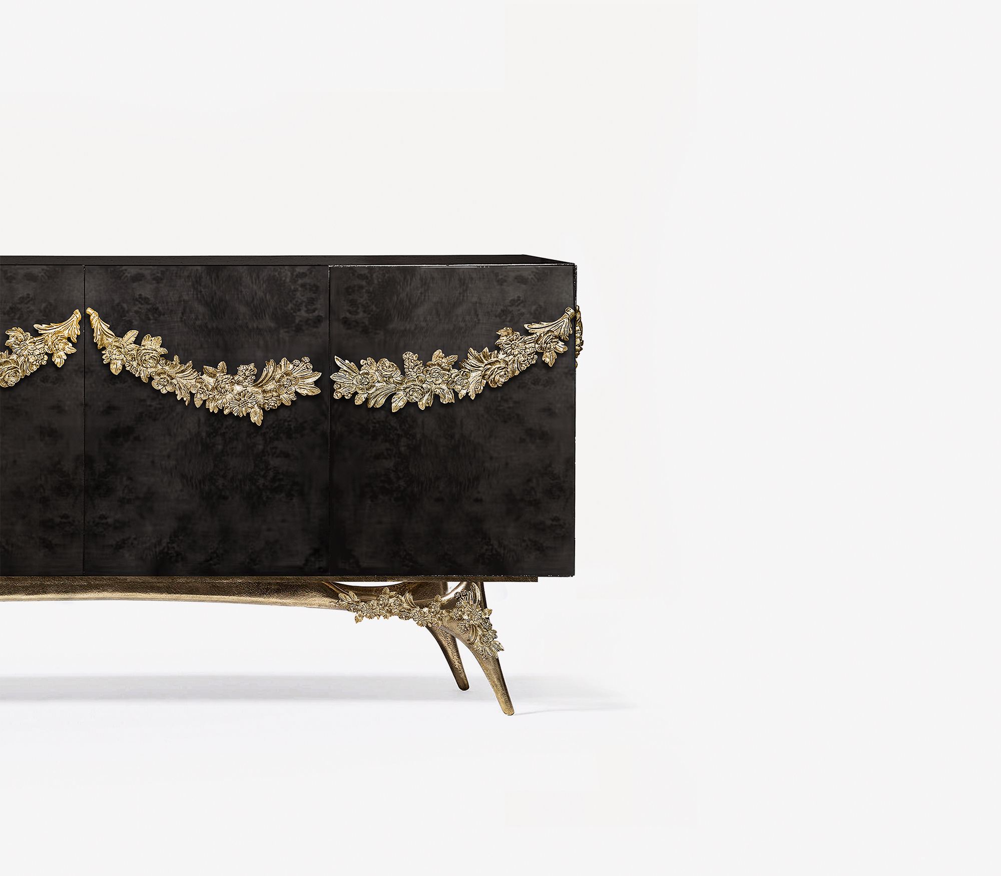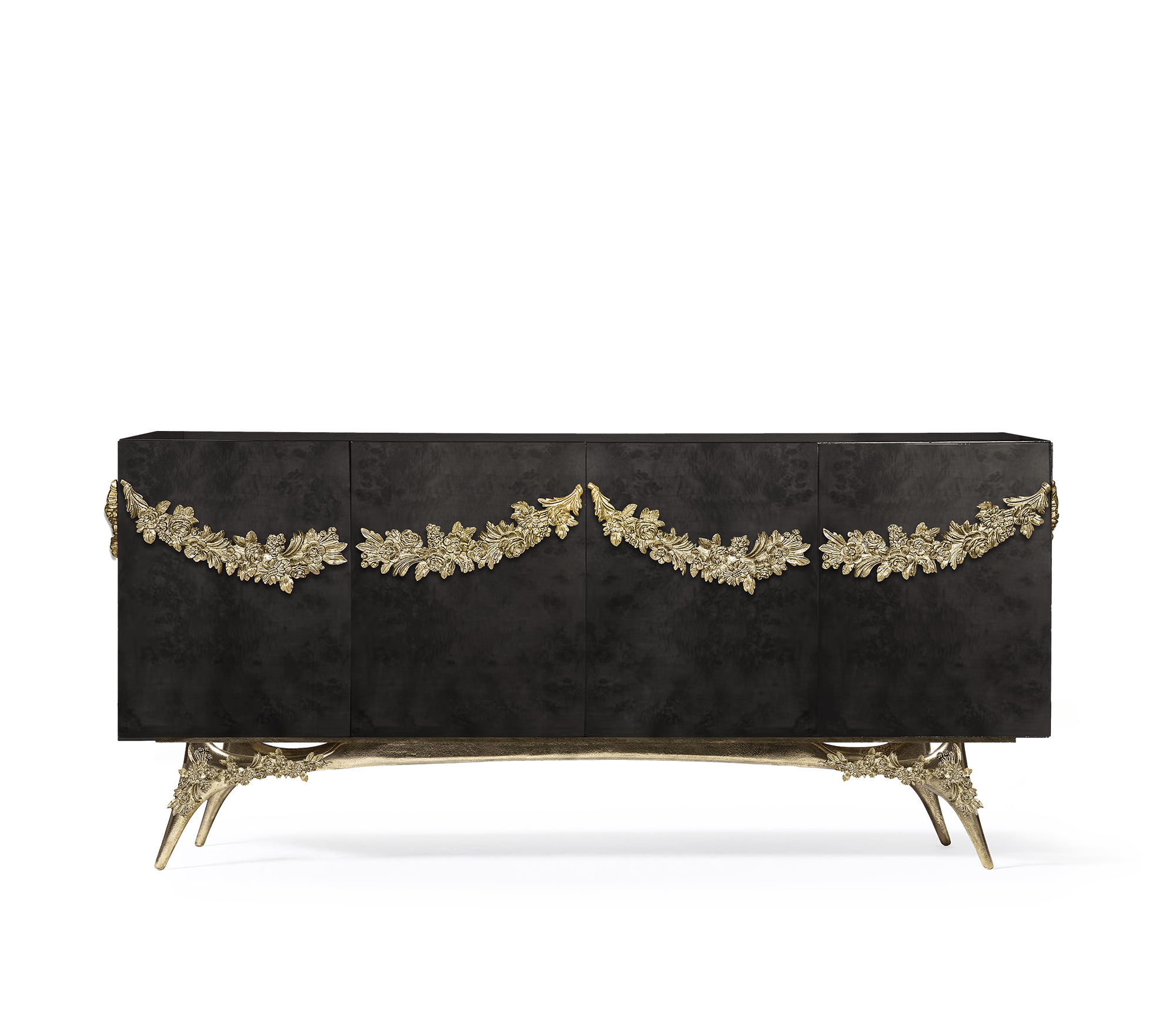 The Majestic reintrepreted by KOKET is a stunning showcase of love for the original Majestic Sideboard by Boca do Lobo. Majestic graces the Infatuation Collection BOCA DO LOBO x KOKET's, highlighting both brands' passion for metalwork. The detailed metal illuminates the formerly wood floral garland ingold as it elegantly drapes across the matte black wood veneer frame. KOKET’s love for flowers carries the floral garland motif onto the piece’s metal base with a graceful touch near each foot, also showcasing the brand’s signature feminine curves.