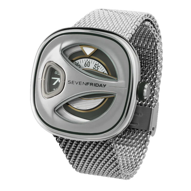 Bezel: Bezel grooved line refilled with Green Berlac lacquer. Top domed part of the bezel horizontally satined. Engraved SEVENFRIDAY Logo in the center