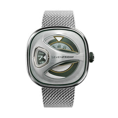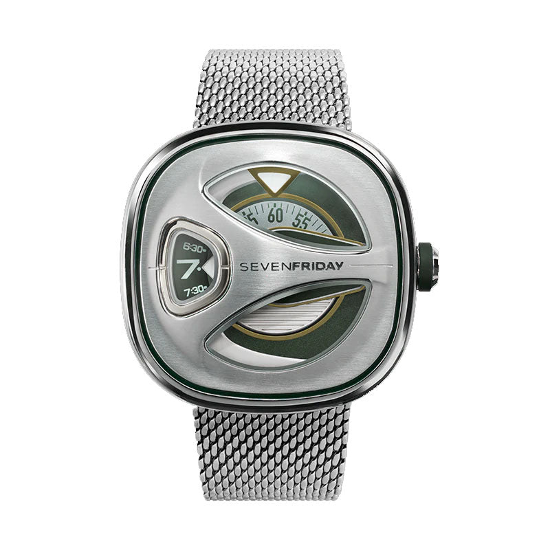 Bezel: Bezel grooved line refilled with Green Berlac lacquer. Top domed part of the bezel horizontally satined. Engraved SEVENFRIDAY Logo in the center