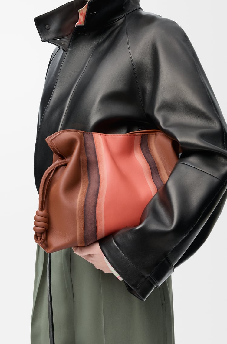 The Flamenco clutch Landscape is a soft and slouchy bag with a cinched closure and historical knot drawstrings. This medium version is crafted in nappa calfskin and suede, layered, compressed and skived to create a one-of-a-kind effect.