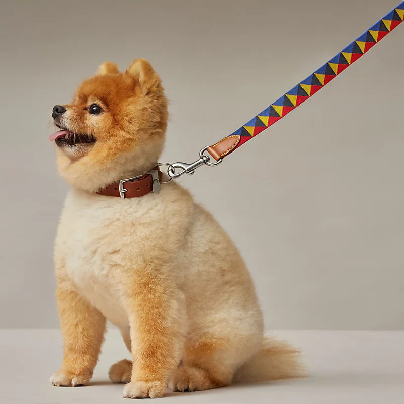 Dog leash and harness in natural bridle leather inspired by the iconic Medor stud, reinterpreted in a graphic version: