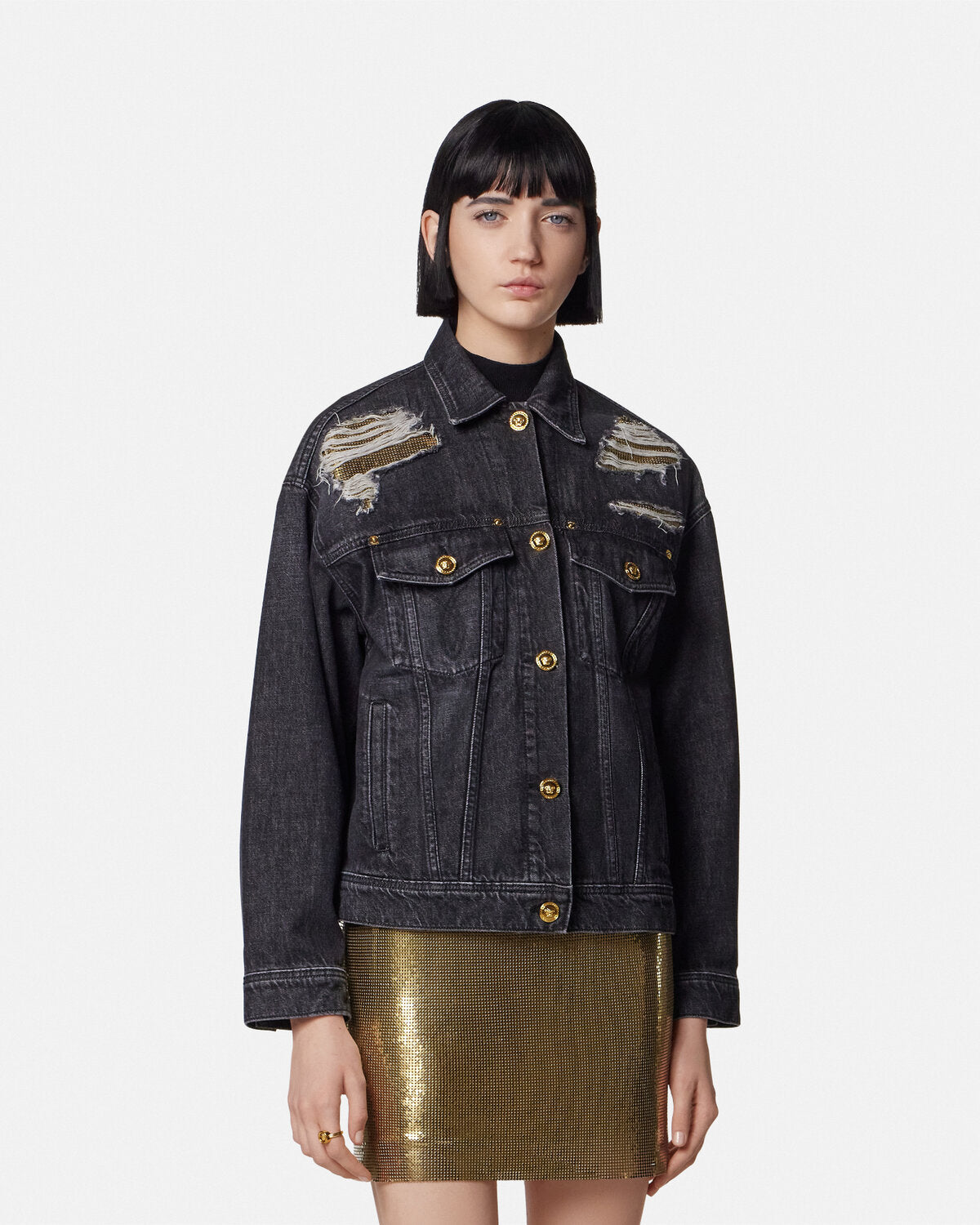 A cotton denim jacket in a dark stonewashed finish with distressed details and metal mesh inserts. The trucker style is detailed by accent Medusa buttons.