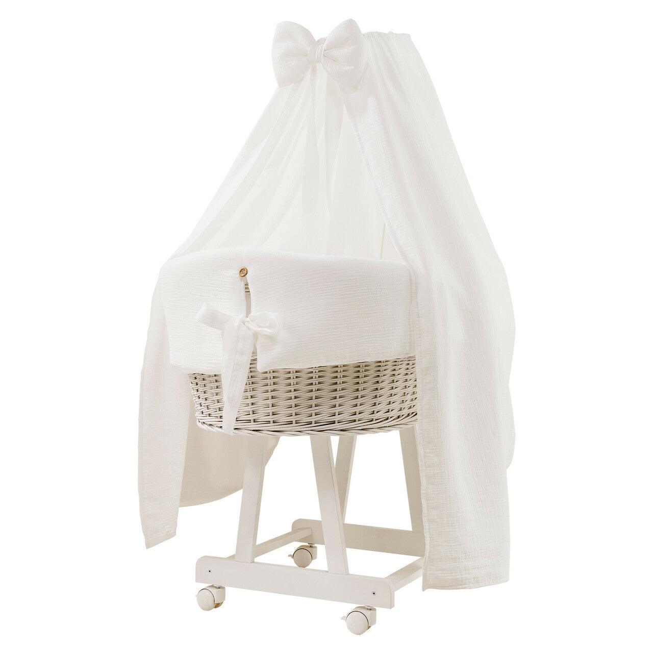 The crib comes fully dressed as shown, including a mattress, fitted sheet and linens. It is made to European safety standards and the fabrics are OEKO-TEX® certified.