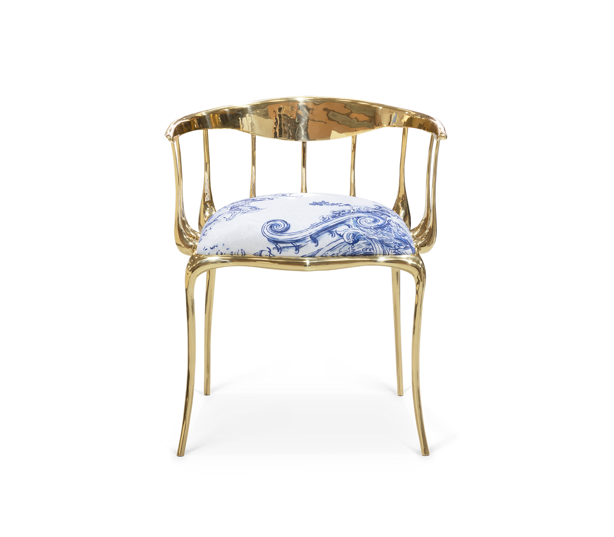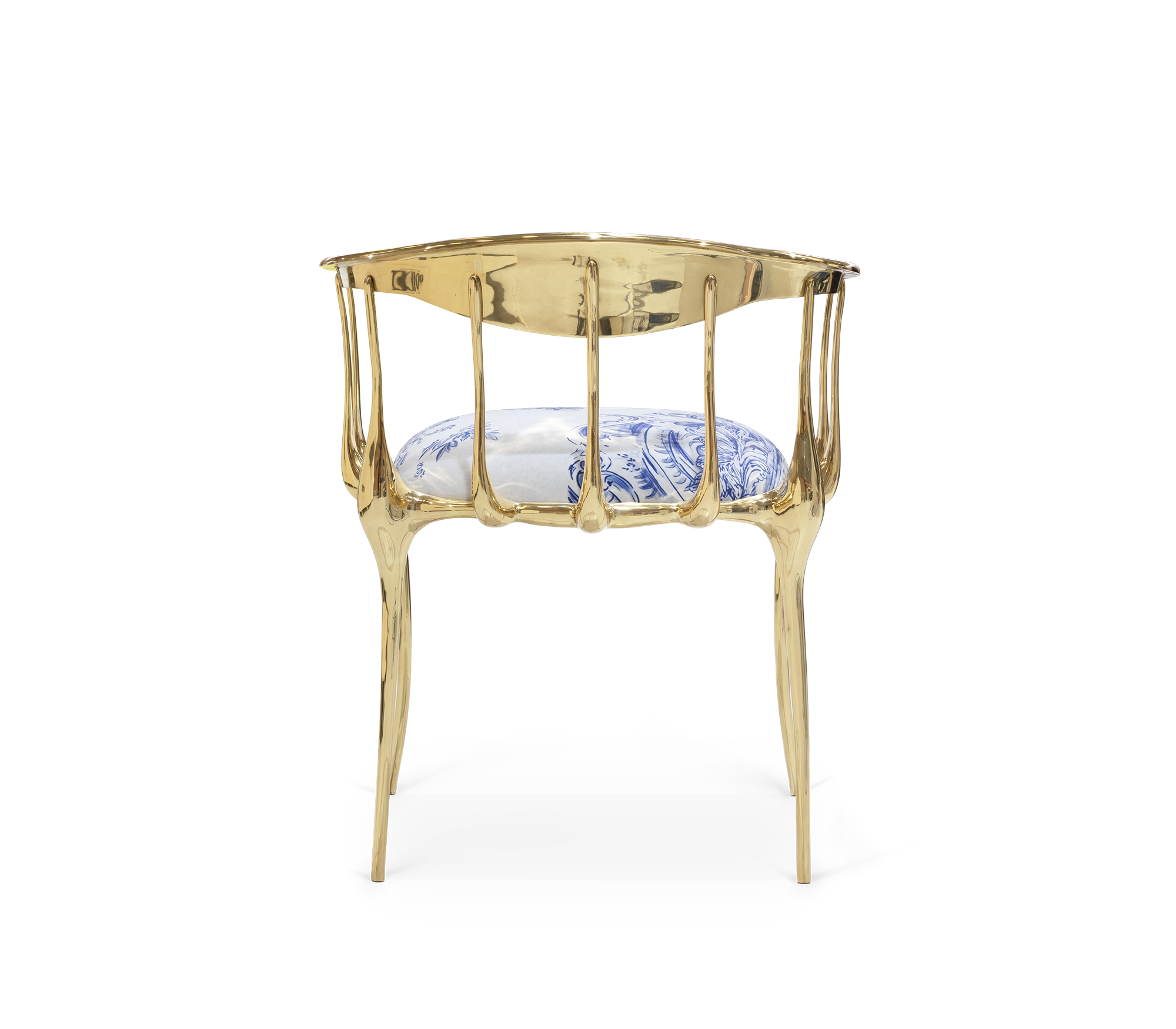The Nº11 chair takes the cue from key figures of the surrealist movement such as Salvador Dali and René Magritte and turns their work into a subtle art furniture piece. Made from gold plated solid cast brass with a varnish finish, this accent chair features a large bow back rail that’s held by languid spindles that drip solid metal from the apron up, while the legs are lavishly curved creating a visual effect that defies the laws of physics. The seat is upholstered in fine velvet with a special azulejos themed fabric. Combining an avant-garde approach with classic and emblematic lines, Nº 11 features remarkable craftsmanship and embodies the richest metalwork techniques from which skilled artisans built their reputation throughout the years. A statement chair to enhance a glamorous experience and memorable moments.