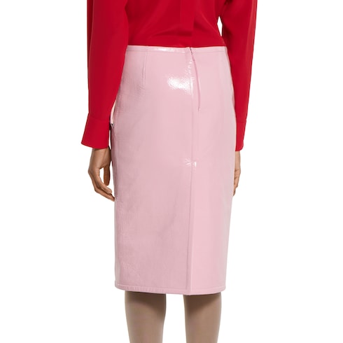 In the Fall Winter 2025 collection, sleek materials and sharp silhouettes define a new take on tailoring. This pencil skirt is crafted in naplak leather and features a back slit and invisible rear zip closure.